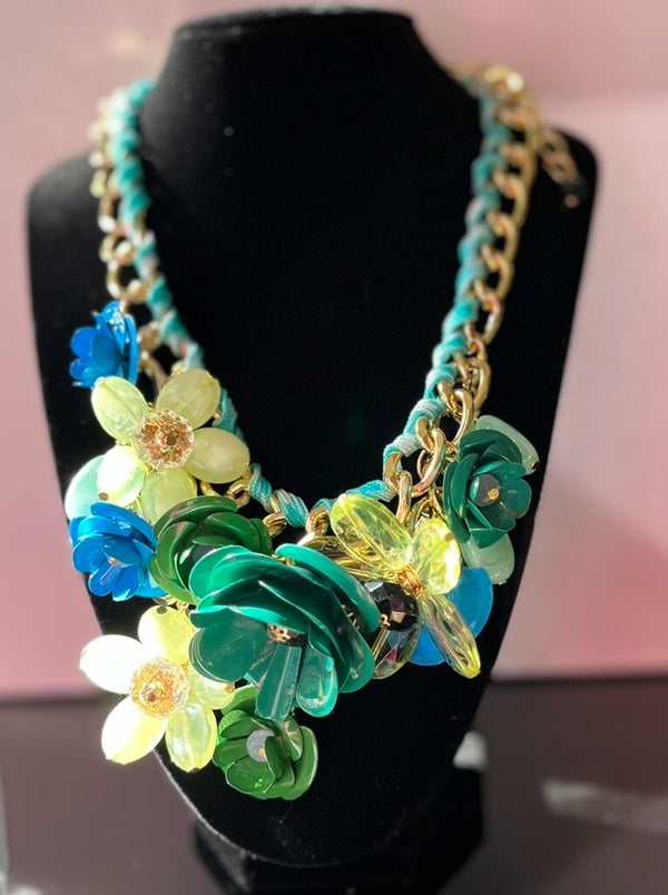 Ce jardin secret à porter autour du cou évoque une floraison éternelle, entre rêverie luxuriante et éclat solaire. Les nuances de vert profond, de jaune citron et de bleu lagon se mêlent en un bouquet généreux, audacieux, plein de vie. Il s’adresse à celles qui osent rayonner, qui portent la nature comme un talisman vibrant.