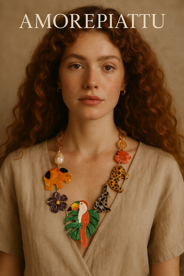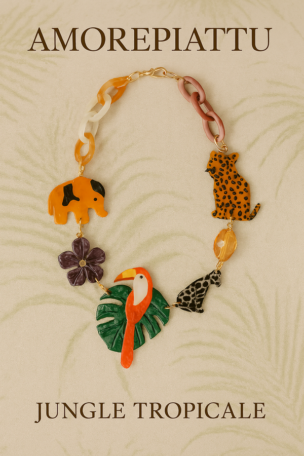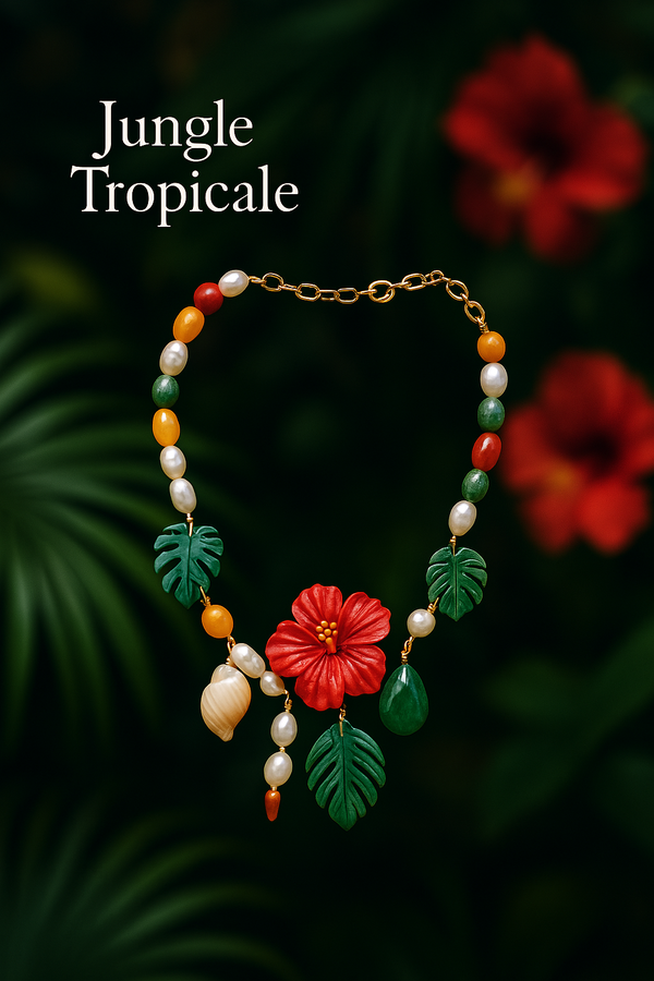 Plongez dans un univers luxuriant avec Jungle Tropicale, un collier audacieux et solaire qui célèbre la richesse exubérante de la nature tropicale.