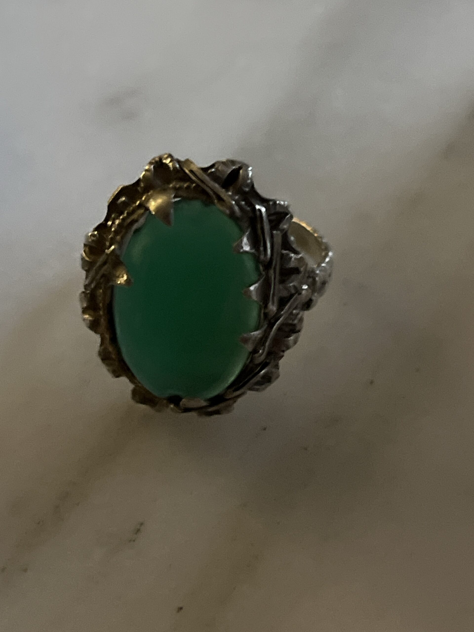 Cette bague met en valeur une agate verte taillée en cabochon, dont la surface lisse révèle une couleur profonde et lumineuse.