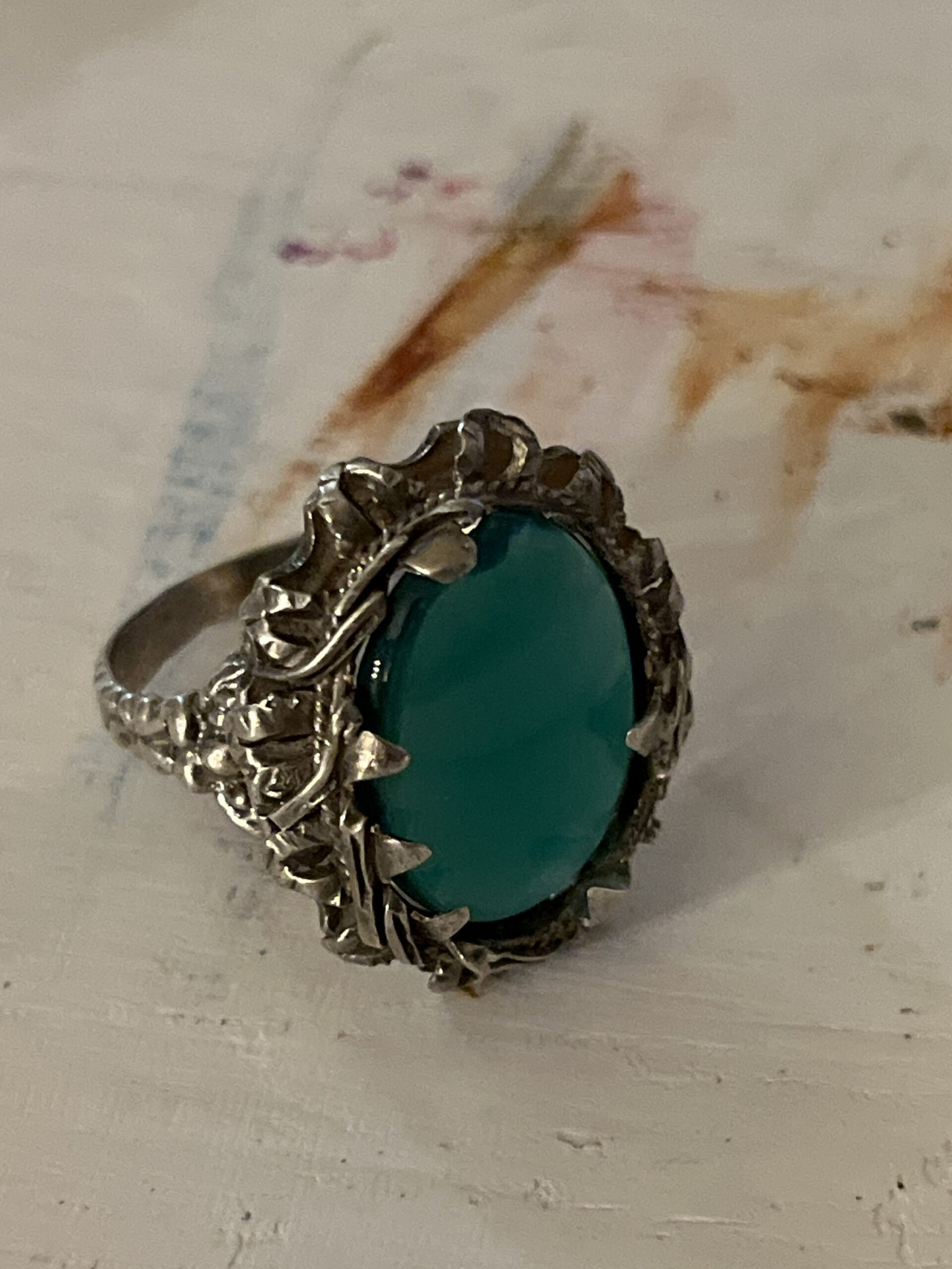 La pierre est sertie dans une monture en argent sculpté aux reliefs organiques, composée de griffes décoratives et de motifs travaillés qui encadrent la pierre et lui donnent une présence forte.