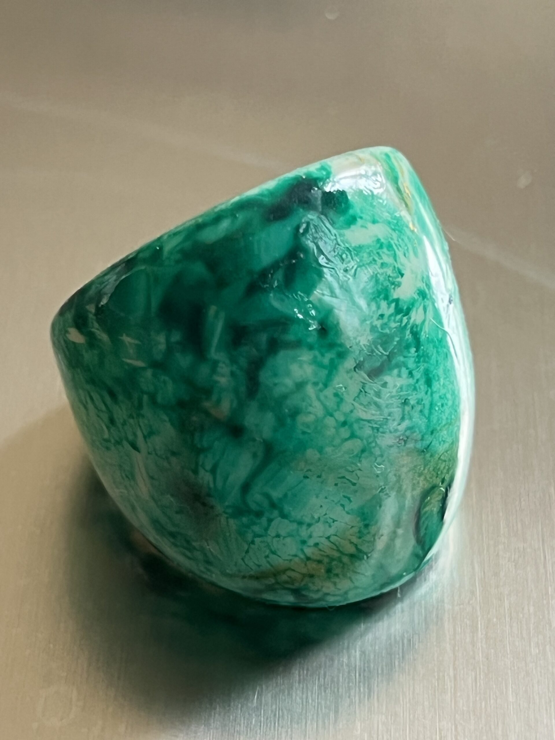 Chaque pièce est unique, révélant des nuances profondes de vert, entre matière minérale et mouvement organique.