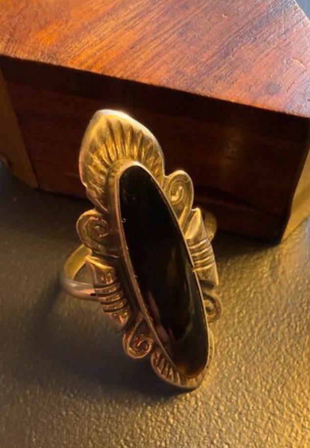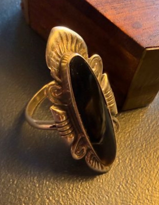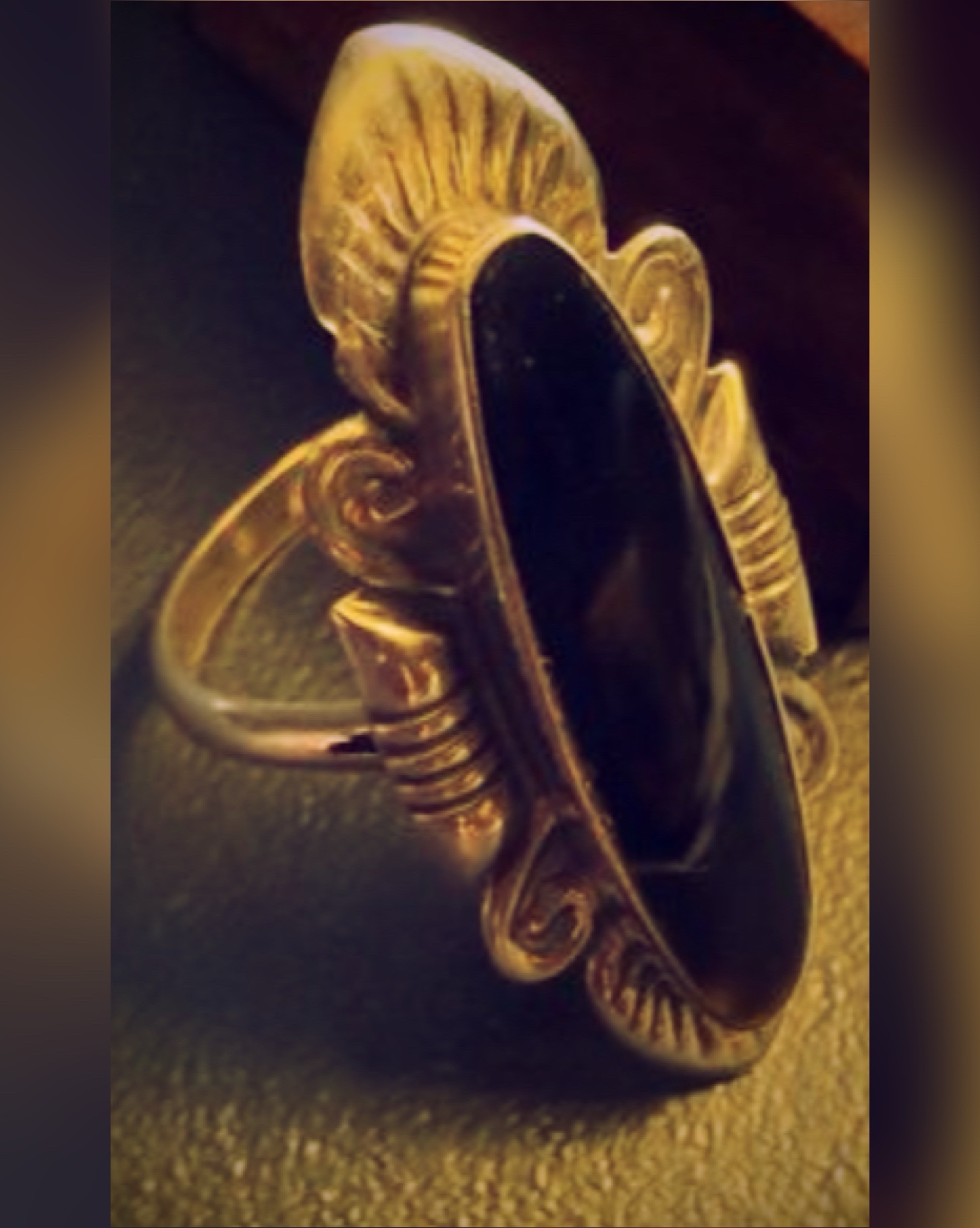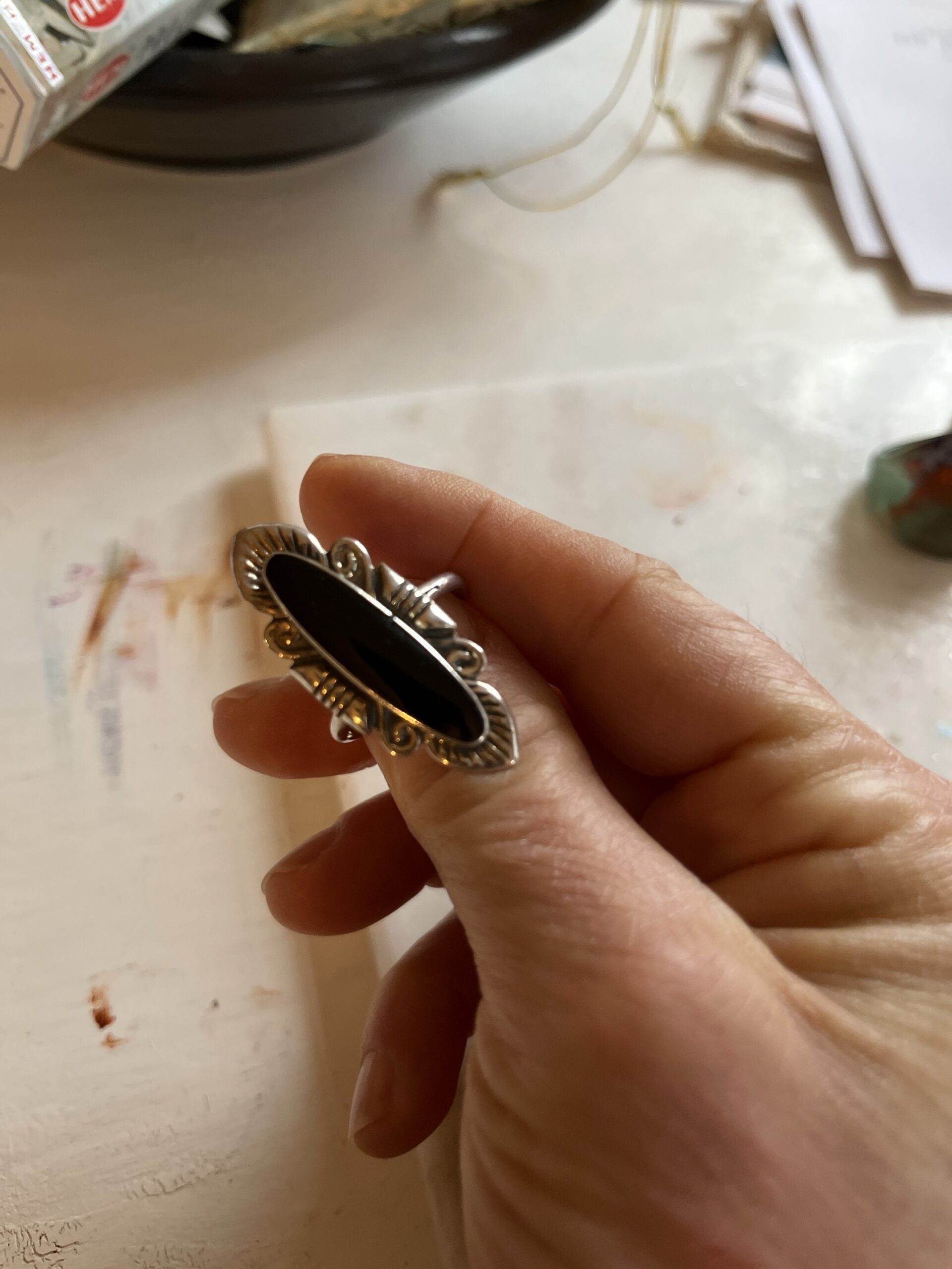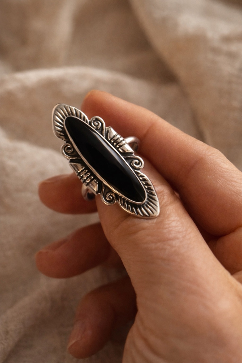 Cette bague en argent massif met en valeur une pierre d’onyx noir taillée en navette, dont la profondeur et l’élégance soulignent la silhouette allongée du bijou.