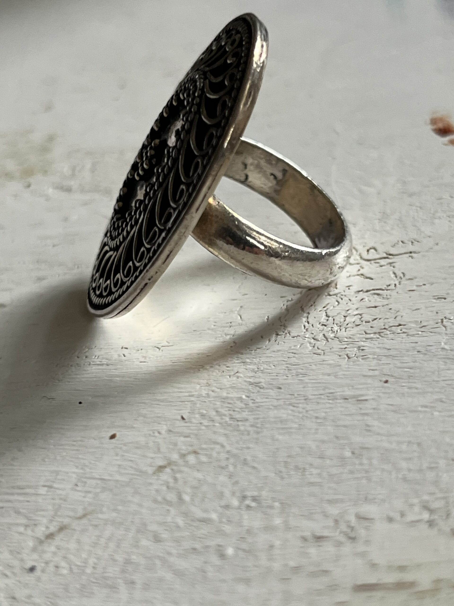 Cette bague en argent massif présente un décor ovale richement travaillé, caractéristique de la bijouterie artisanale inspirée des traditions asiatiques.