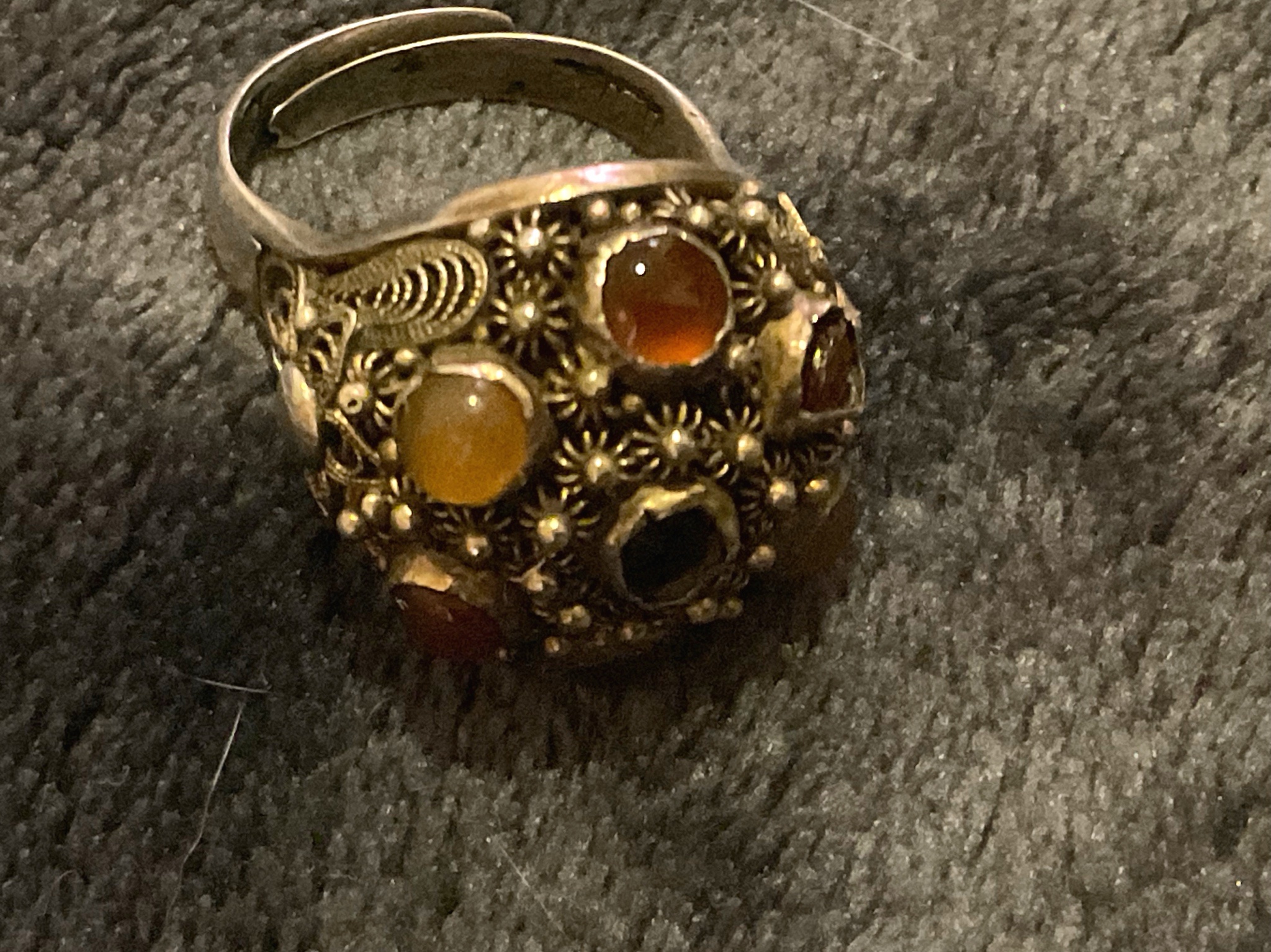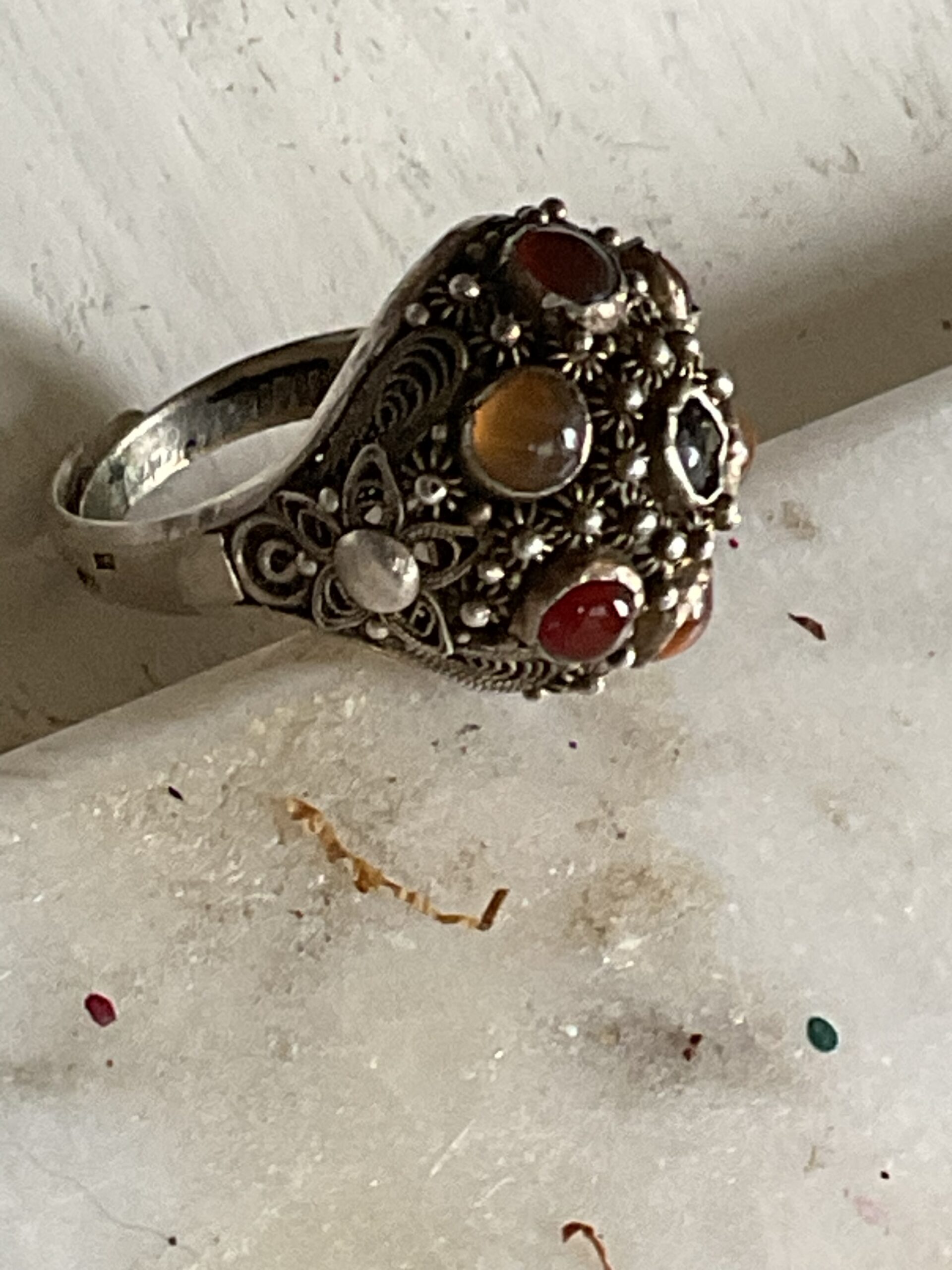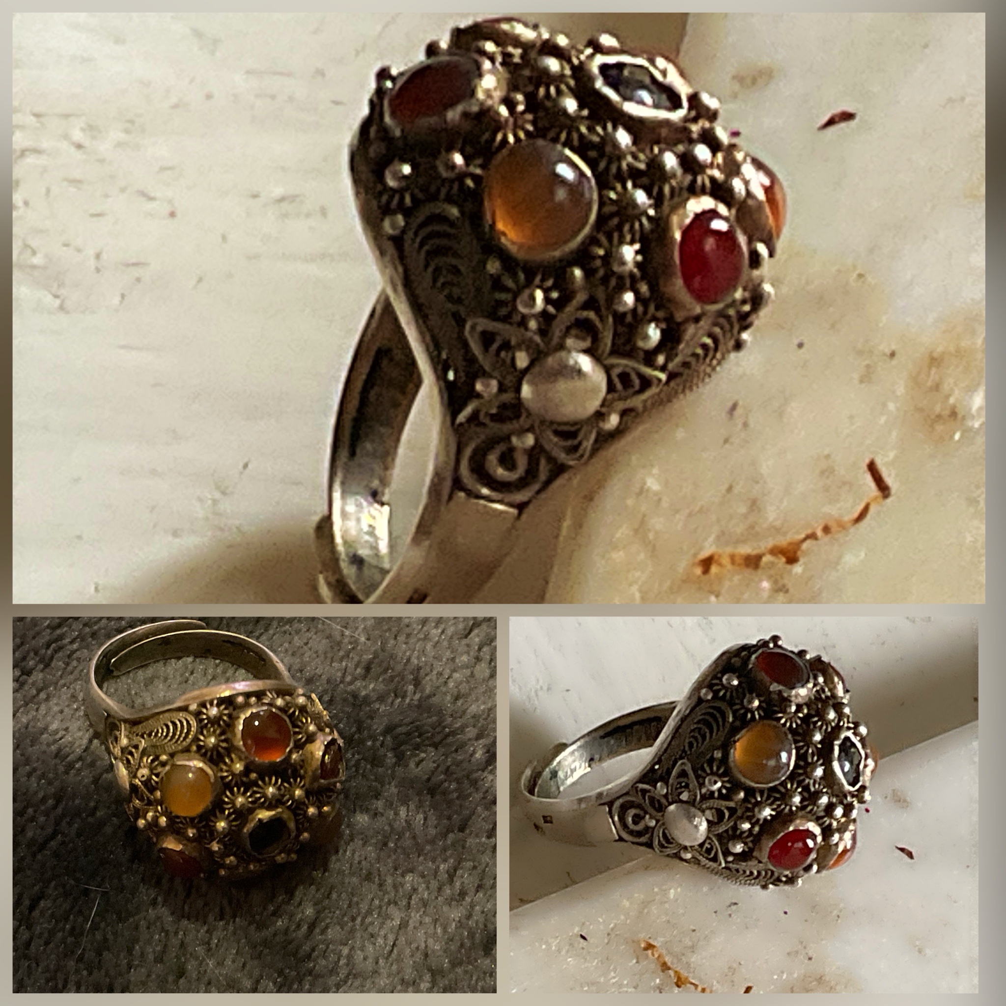 Bague ancienne en argent massif (925), au volume sculptural, entièrement travaillée en relief et sertie de cabochons aux nuances chaudes : ambre, miel et rouge profond.