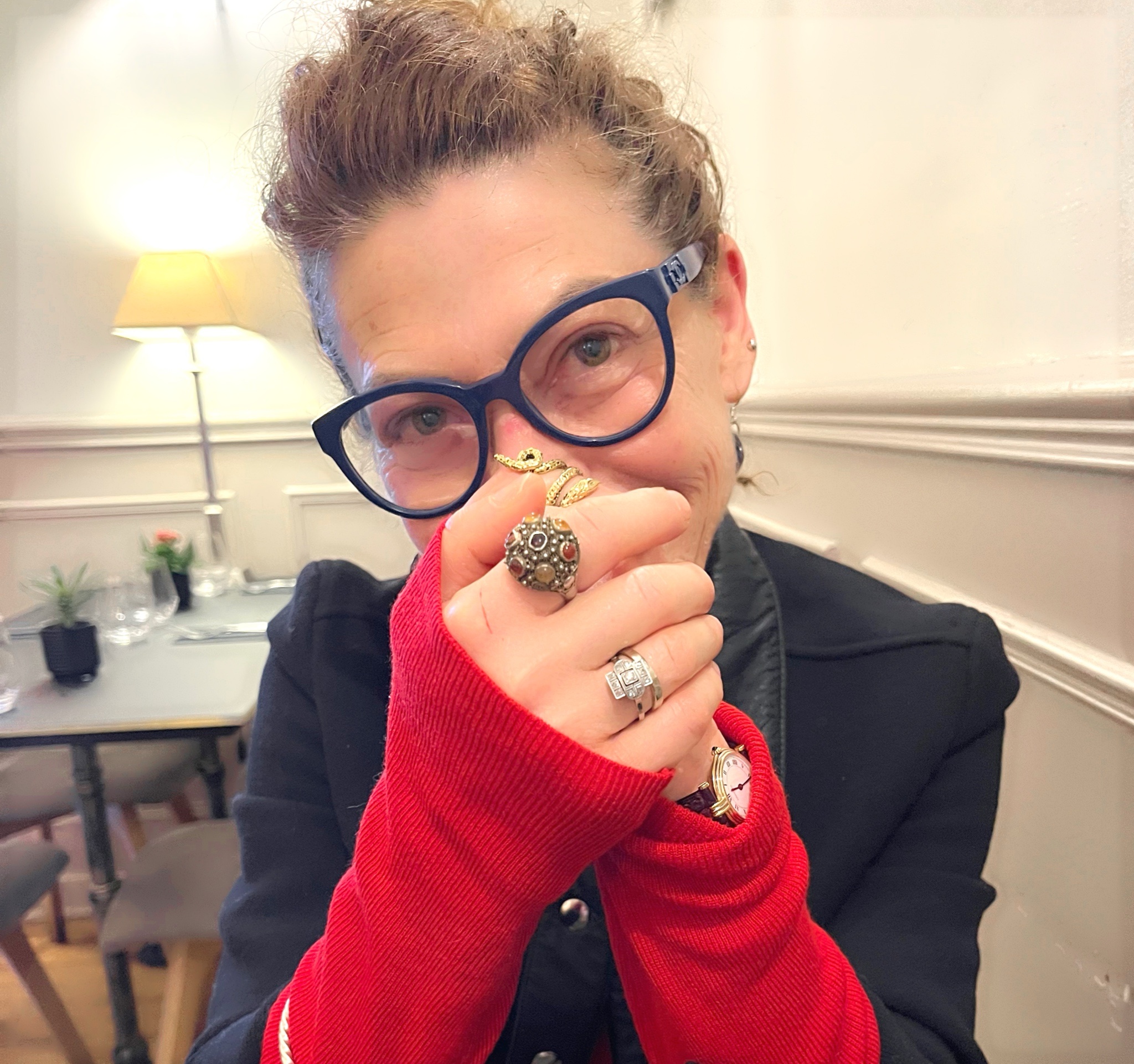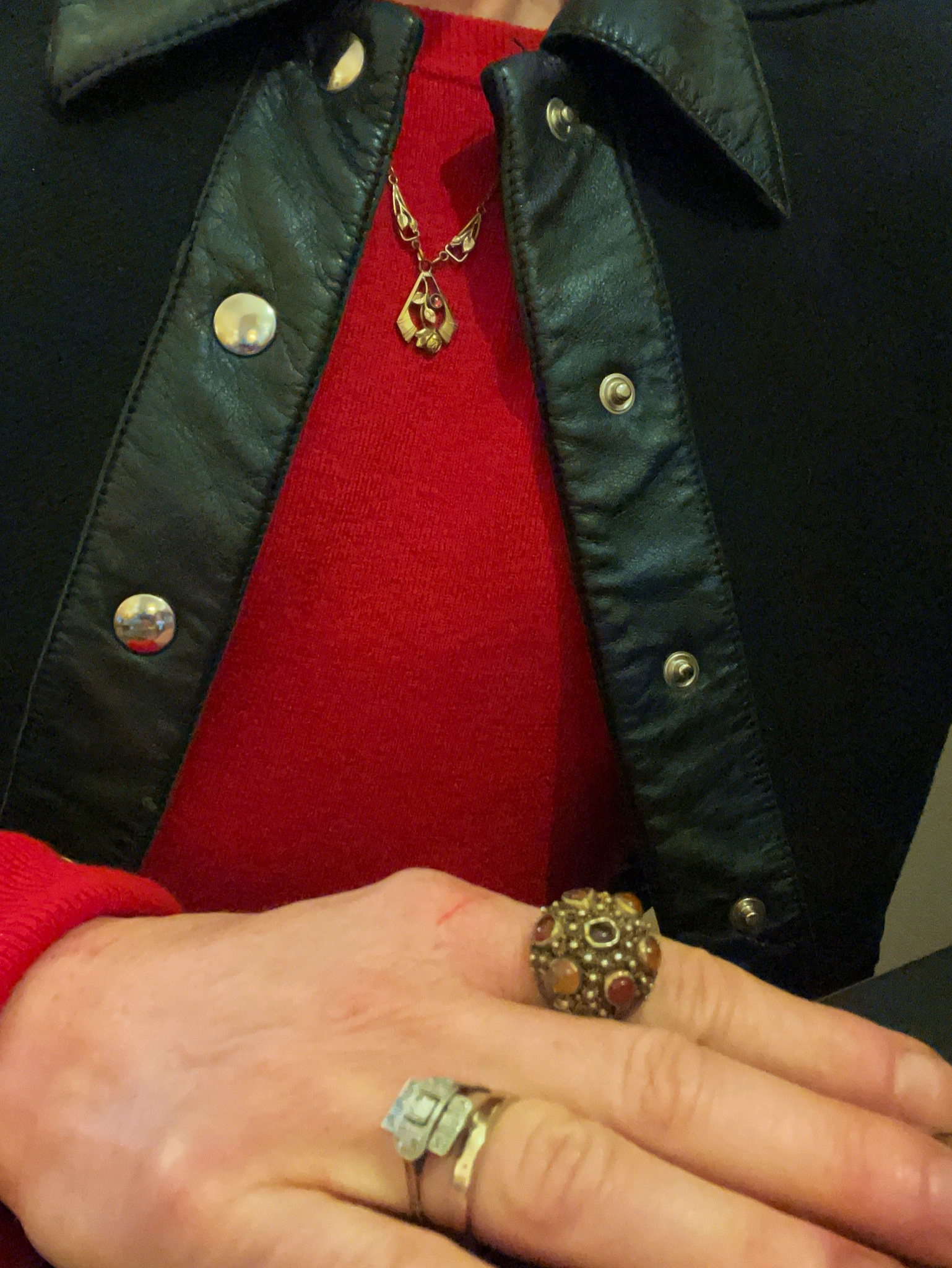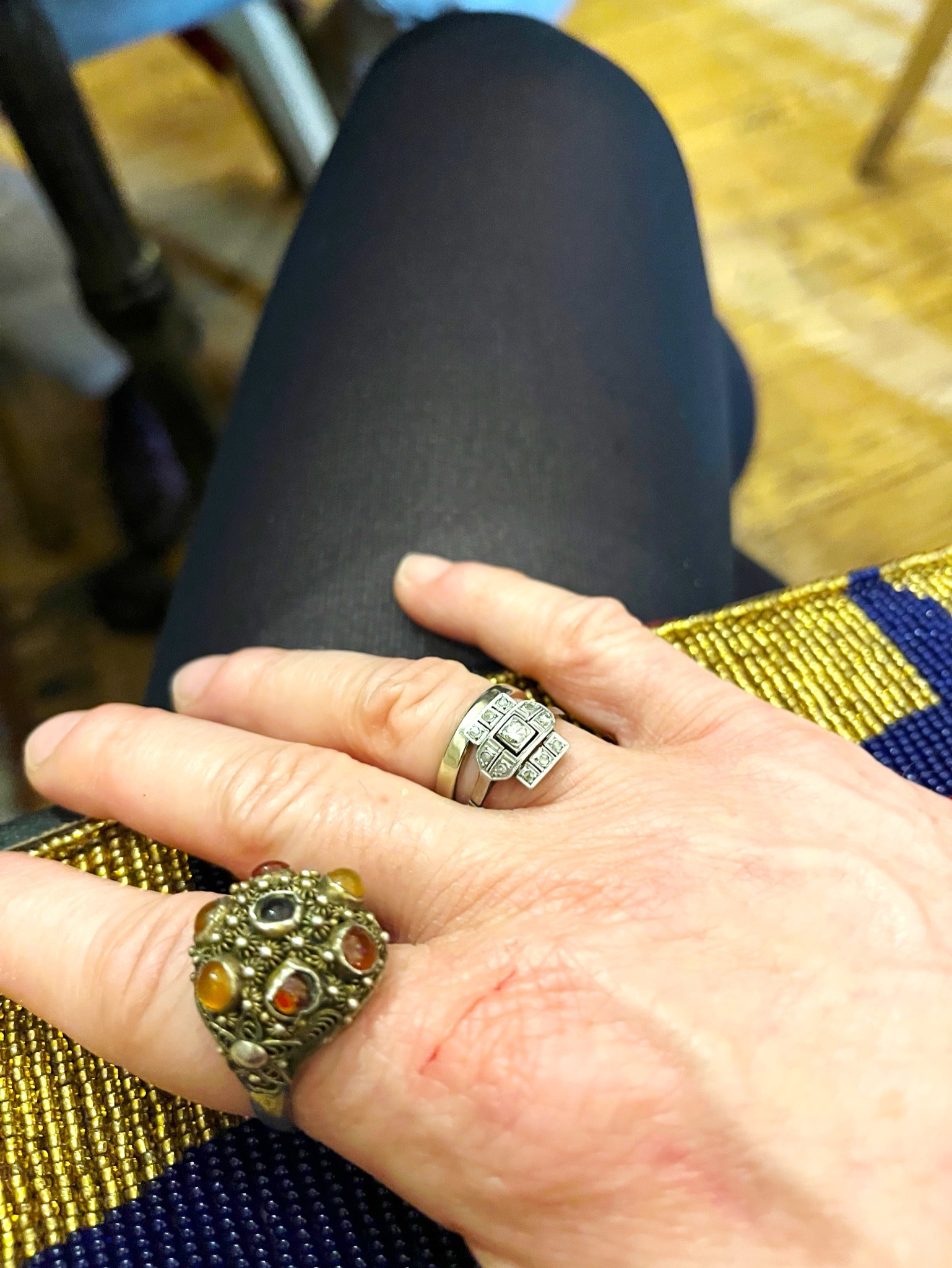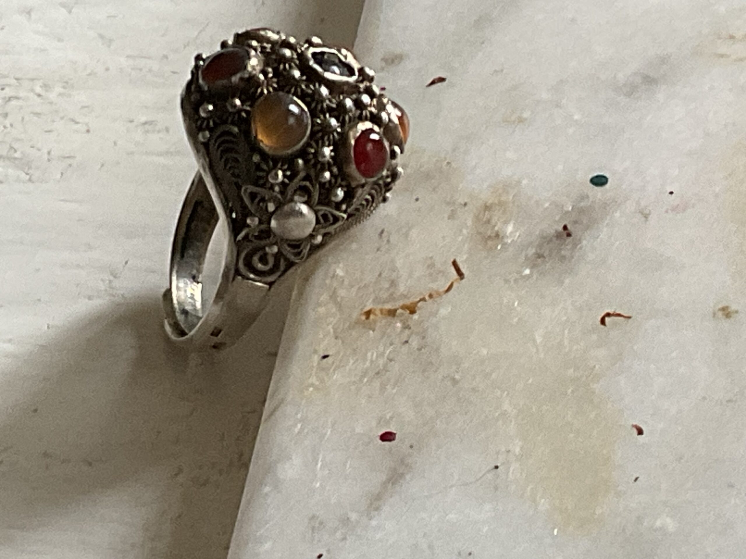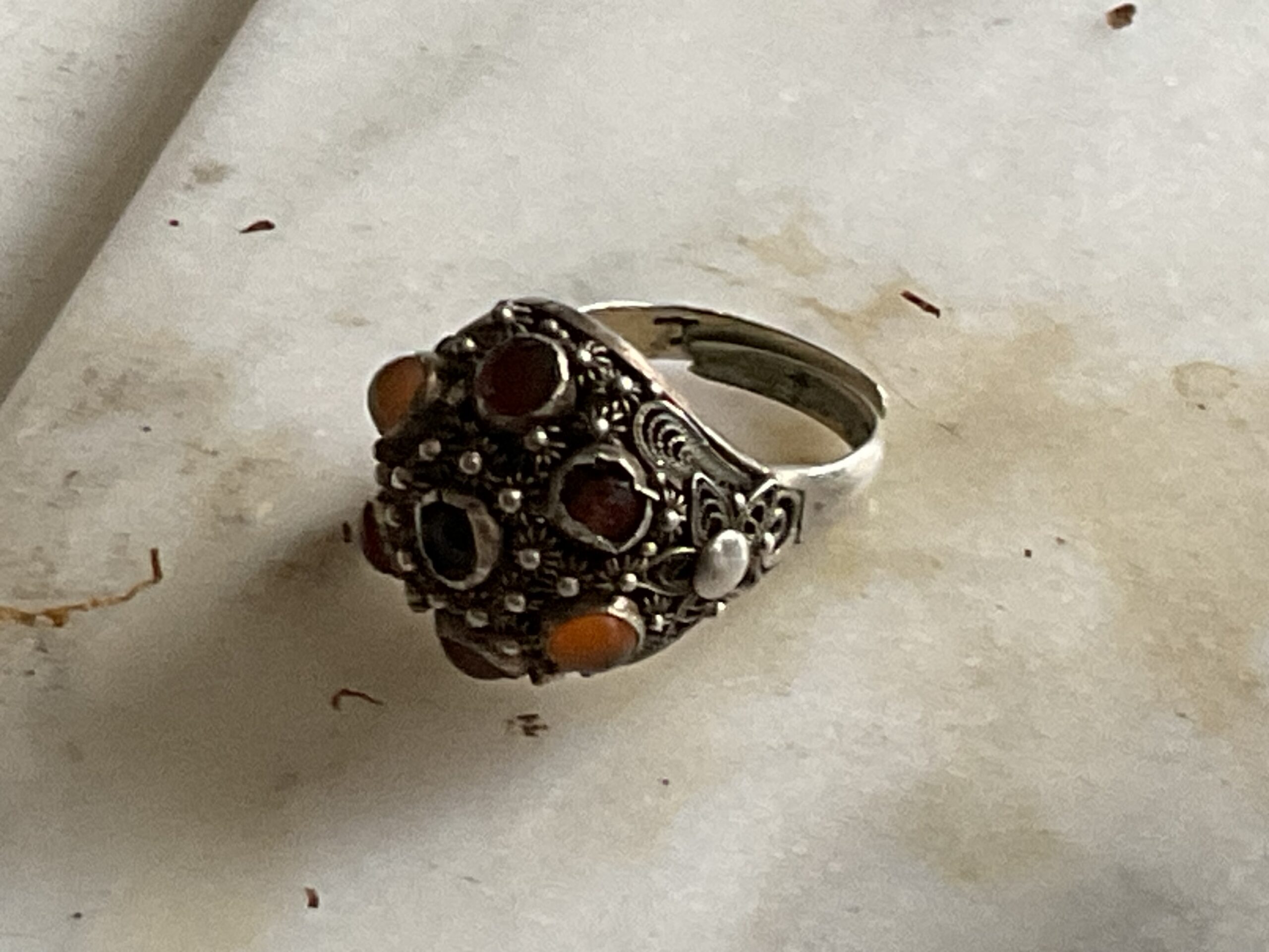 Une bague qui ne suit pas une tendance. Une bague qui affirme. Elle habille une main comme une pièce couture habille une silhouette. Bague ancienne en argent, plateau bombé serti de cabochons tons ambre et rouge.