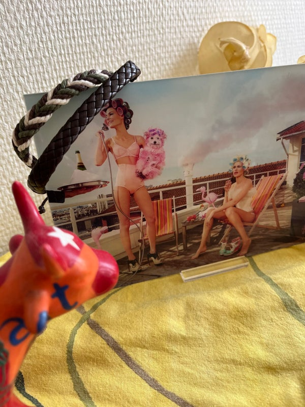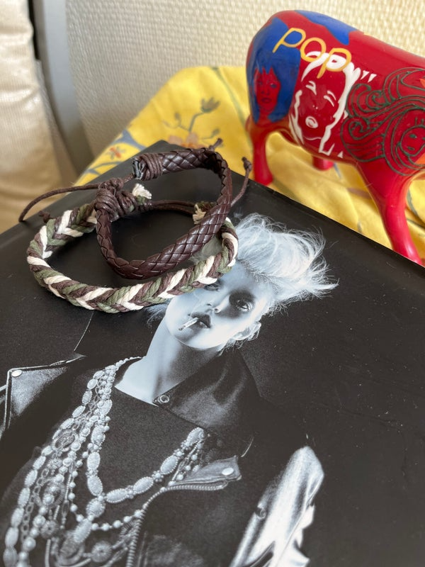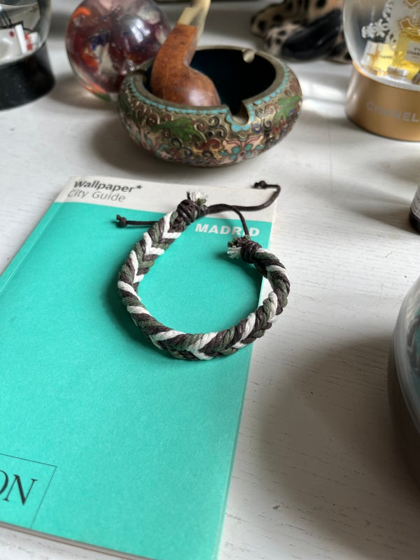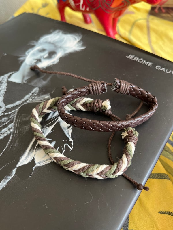 Deux bracelets tressés à la main. L’un en cuir célébrant les terres lointaines, les cultures ancestrales, l’autre aux couleurs naturelles – vert olive, brun, écru – qui évoque la terre, les voyages et l’aventure. Léger, souple et confortable, il s’ajuste à tous les poignets grâce à son cordon coulissant.
