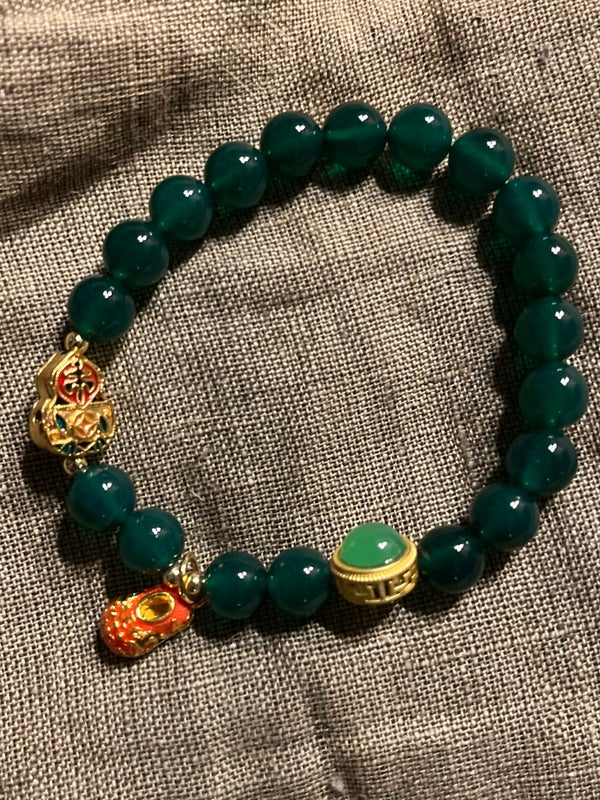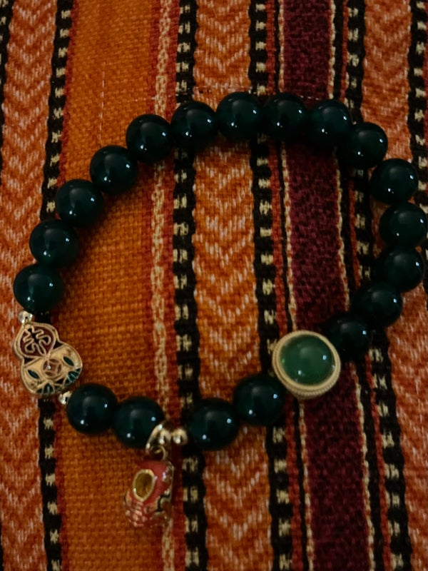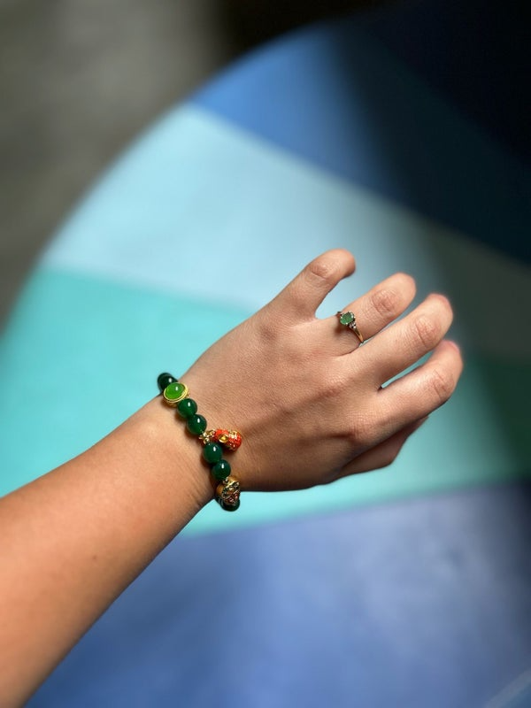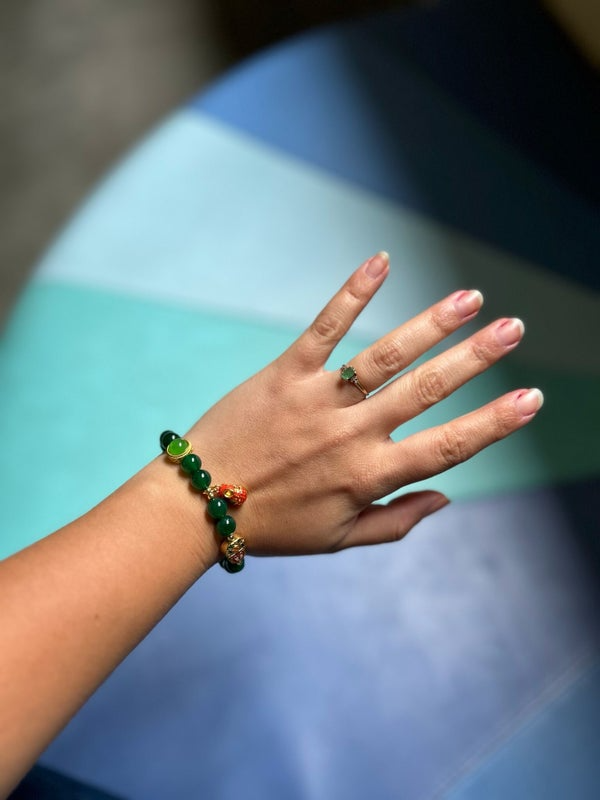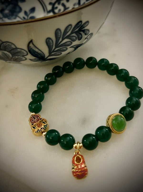 Ce bracelet raffiné marie l’éclat profond de perles vert émeraude à l’élégance symbolique de charms dorés et colorés inspirés de l’art asiatique. Chaque détail évoque une richesse culturelle :