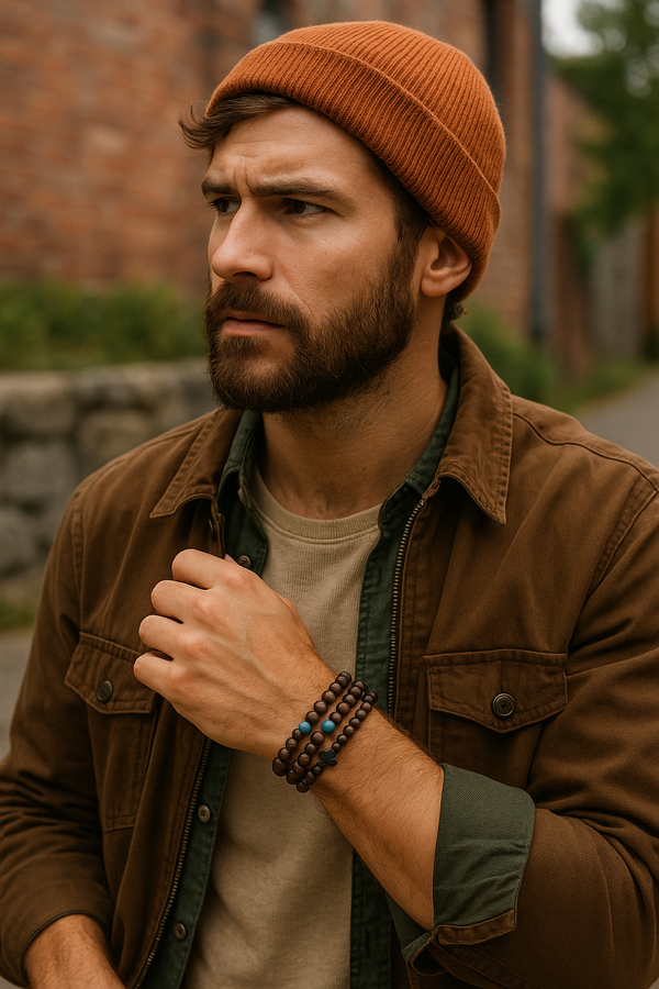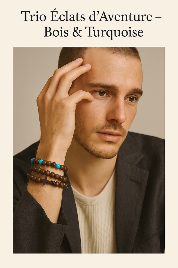Ce trio de bracelets évoque la force tranquille de la nature et l’âme voyageuse. Réalisés en perles de bois aux teintes profondes et chaleureuses, chaque bracelet possède sa propre identité tout en s’harmonisant avec les autres. Des touches de turquoise apportent une note vibrante, tandis qu’une croix en hématite vient souligner la dimension spirituelle et symbolique de l’ensemble. À porter ensemble pour un effet audacieux, ou séparément selon l’humeur du jour.