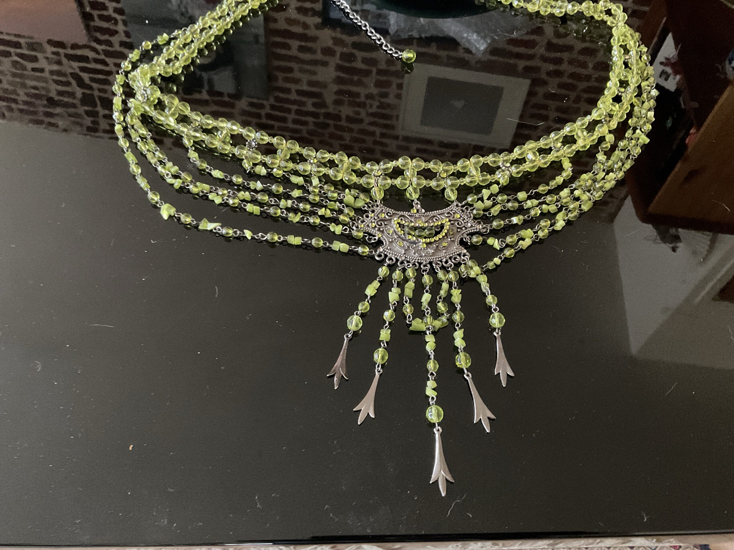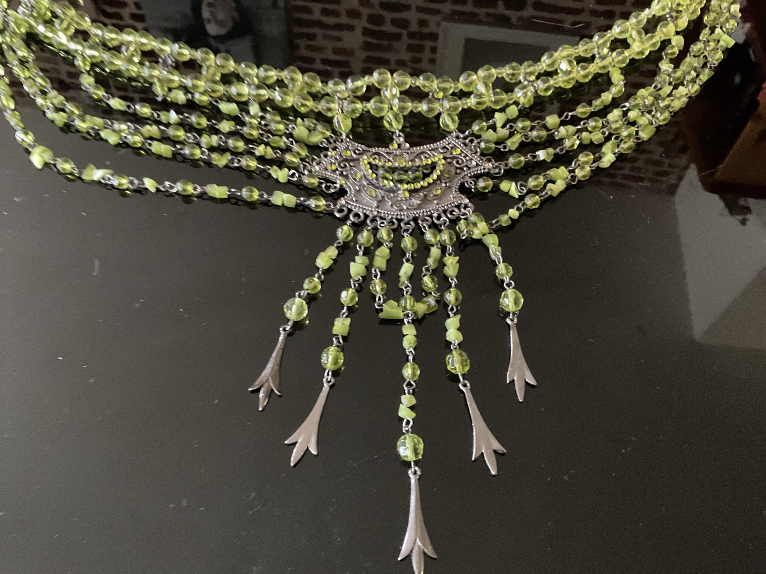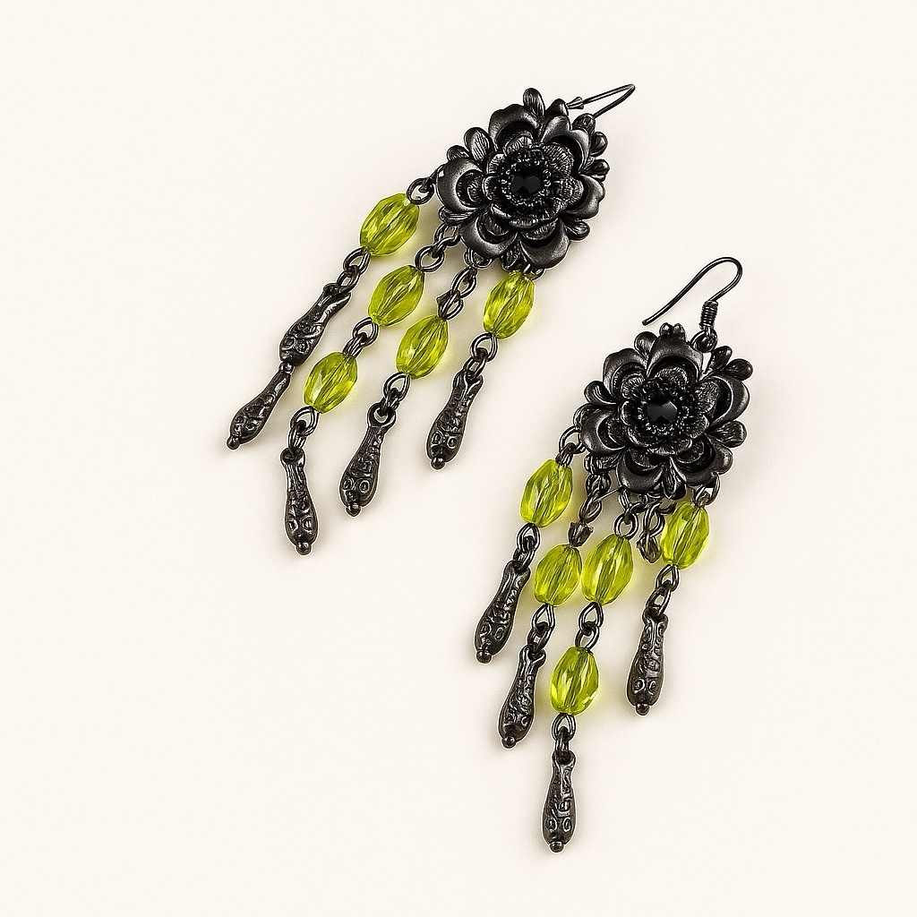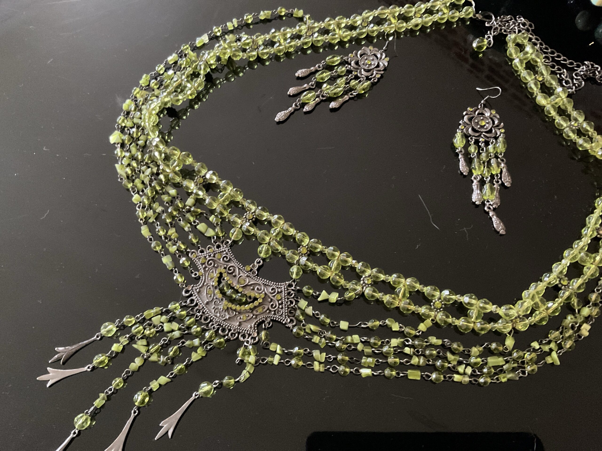 Ceinture et boucles d’oreilles Andalusia.. Parure artisanale aux nuances vertes lumineuses, composée d’une ceinture fluide et de boucles d’oreilles en cascade. Motif floral en métal patiné, perles translucides aux reflets vibrants, chaînettes fines et pampilles mobiles : chaque élément capte la lumière et accompagne le mouvement. Portée comme une ligne de silhouette, la ceinture souligne la taille avec délicatesse, tandis que les boucles encadrent le visage avec élégance.