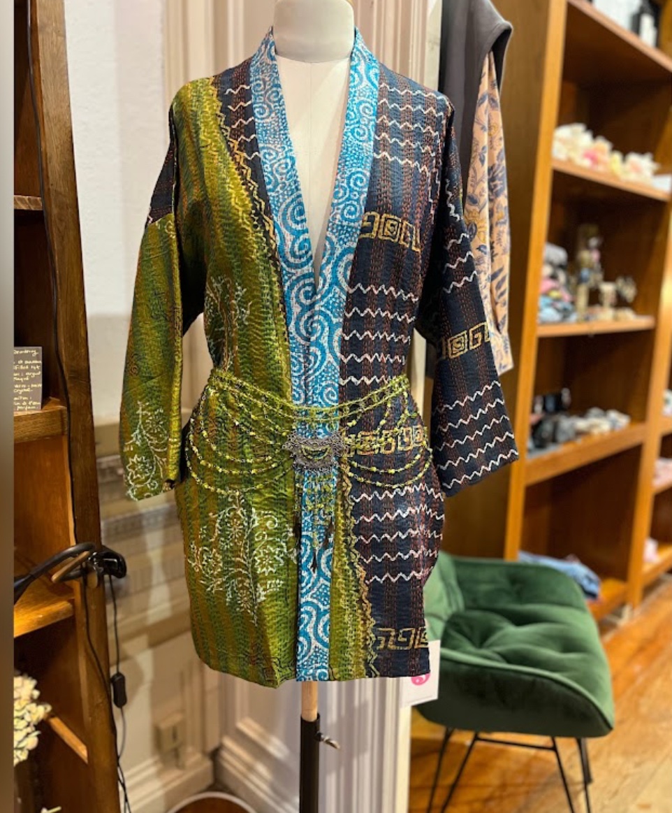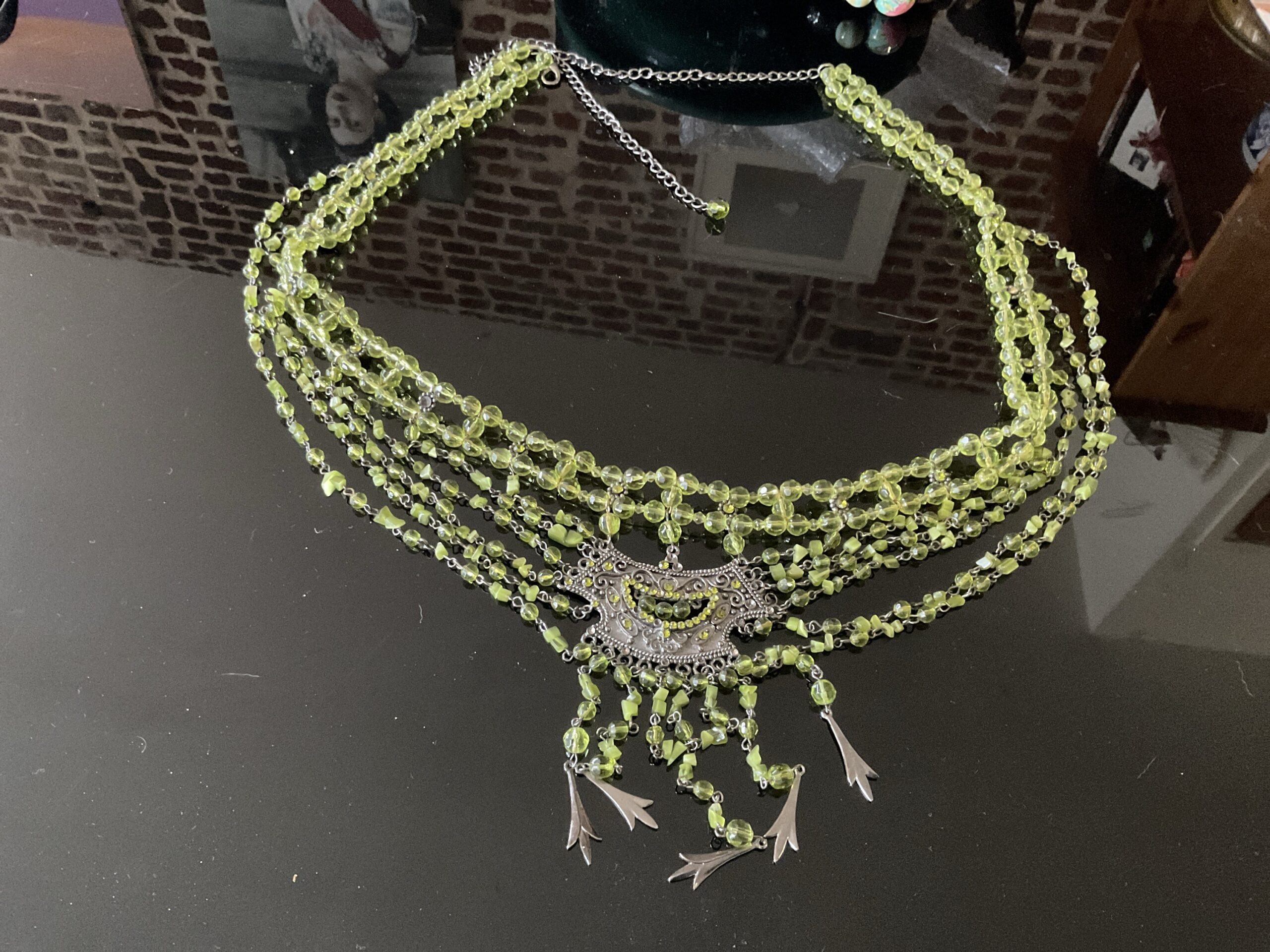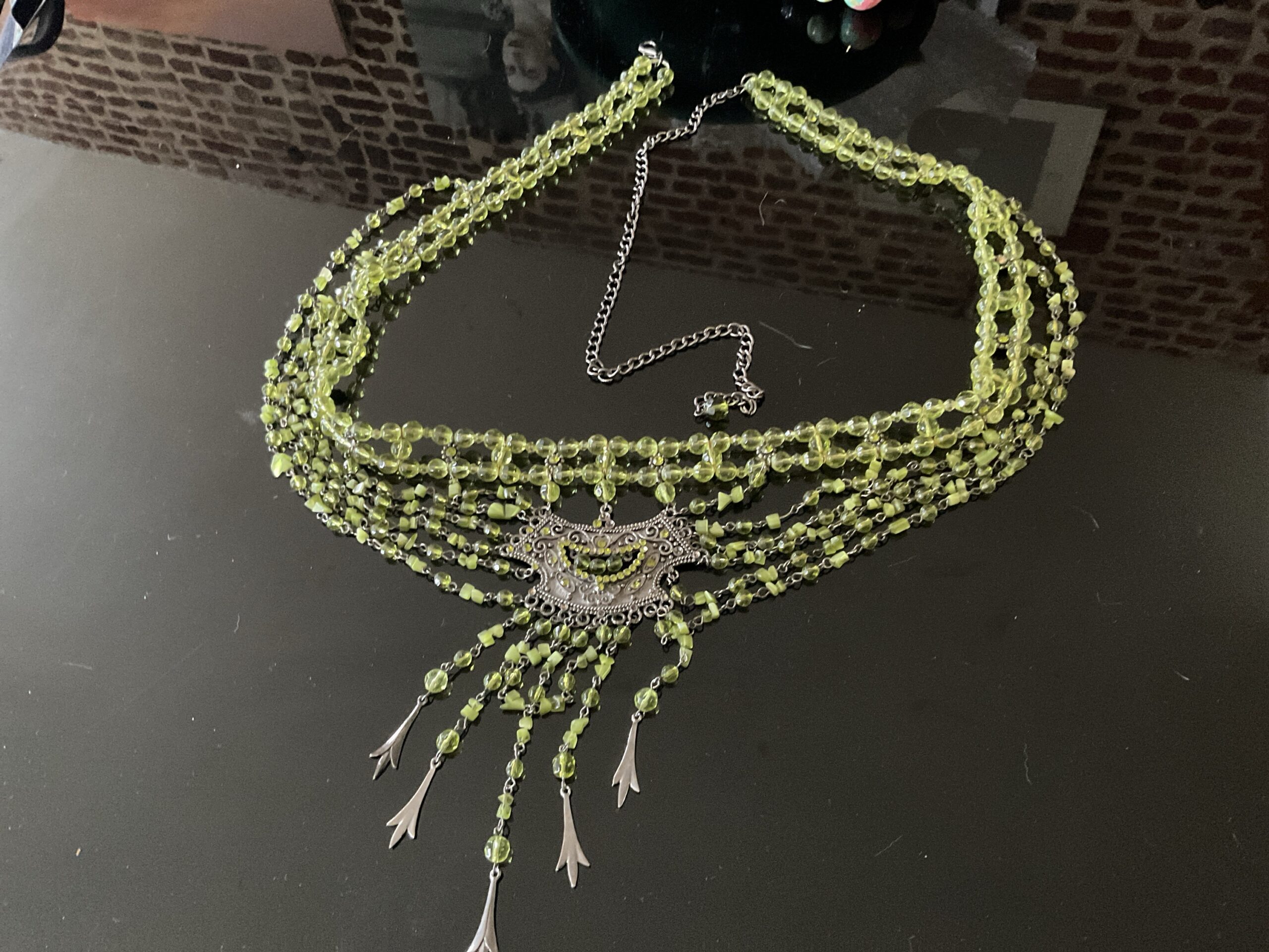 Ceinture et boucles d’oreilles Andalusia.. Parure artisanale aux nuances vertes lumineuses, composée d’une ceinture fluide et de boucles d’oreilles en cascade. Motif floral en métal patiné, perles translucides aux reflets vibrants, chaînettes fines et pampilles mobiles : chaque élément capte la lumière et accompagne le mouvement. Portée comme une ligne de silhouette, la ceinture souligne la taille avec délicatesse, tandis que les boucles encadrent le visage avec élégance.