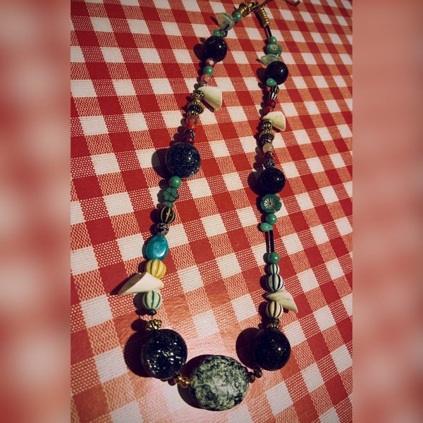 • Perles noires en verre aventuriné : elles évoquent la profondeur du ciel nocturne par leurs éclats scintillants.