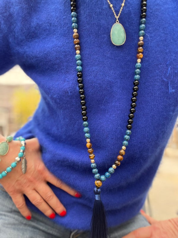 Ce collier long à pompon incarne les couleurs profondes de la mer et de la terre, dans une composition équilibrée et artisanale.