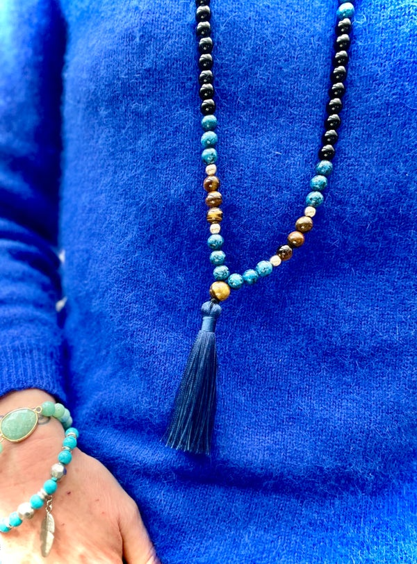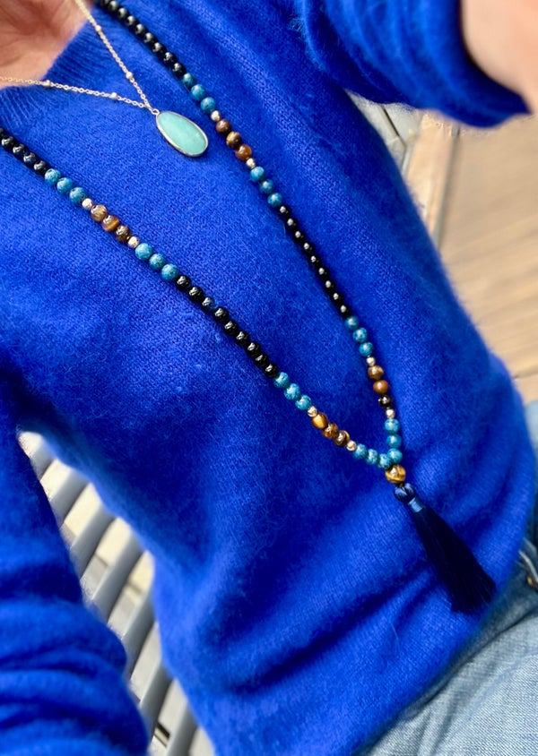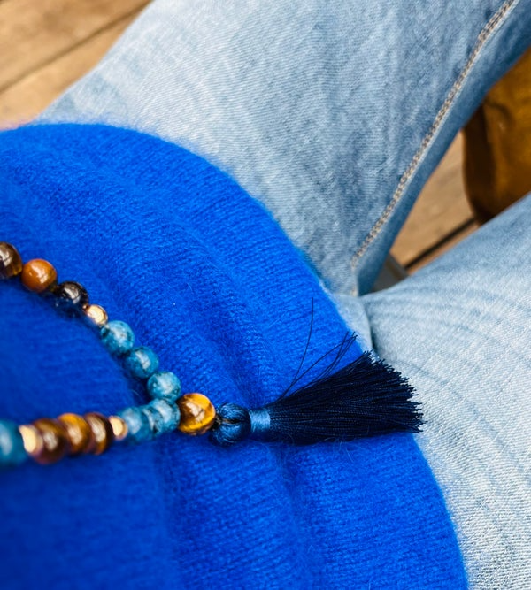 Un pompon bleu nuit finalise la pièce, ajoutant du mouvement et une touche spirituelle dans le style des malas orientaux.