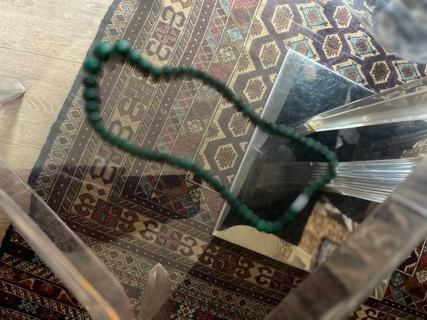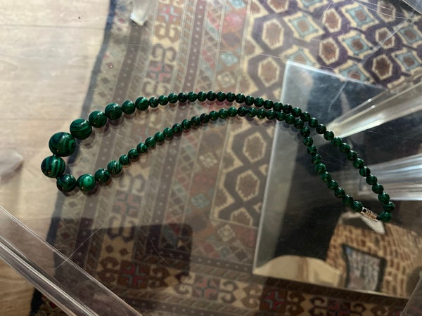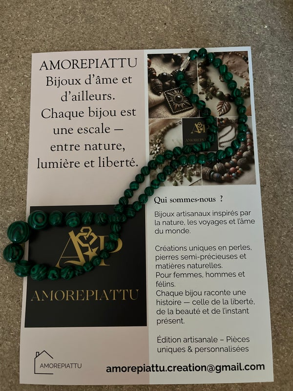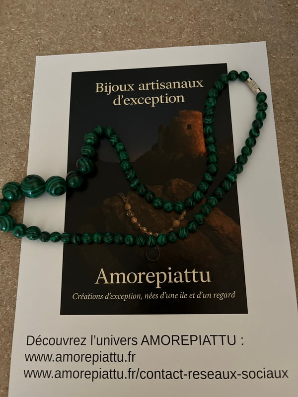 Élégance brute et symbolique profonde pour ce collier double rang entièrement composé de véritables perles de malachite, soigneusement polies à la main.