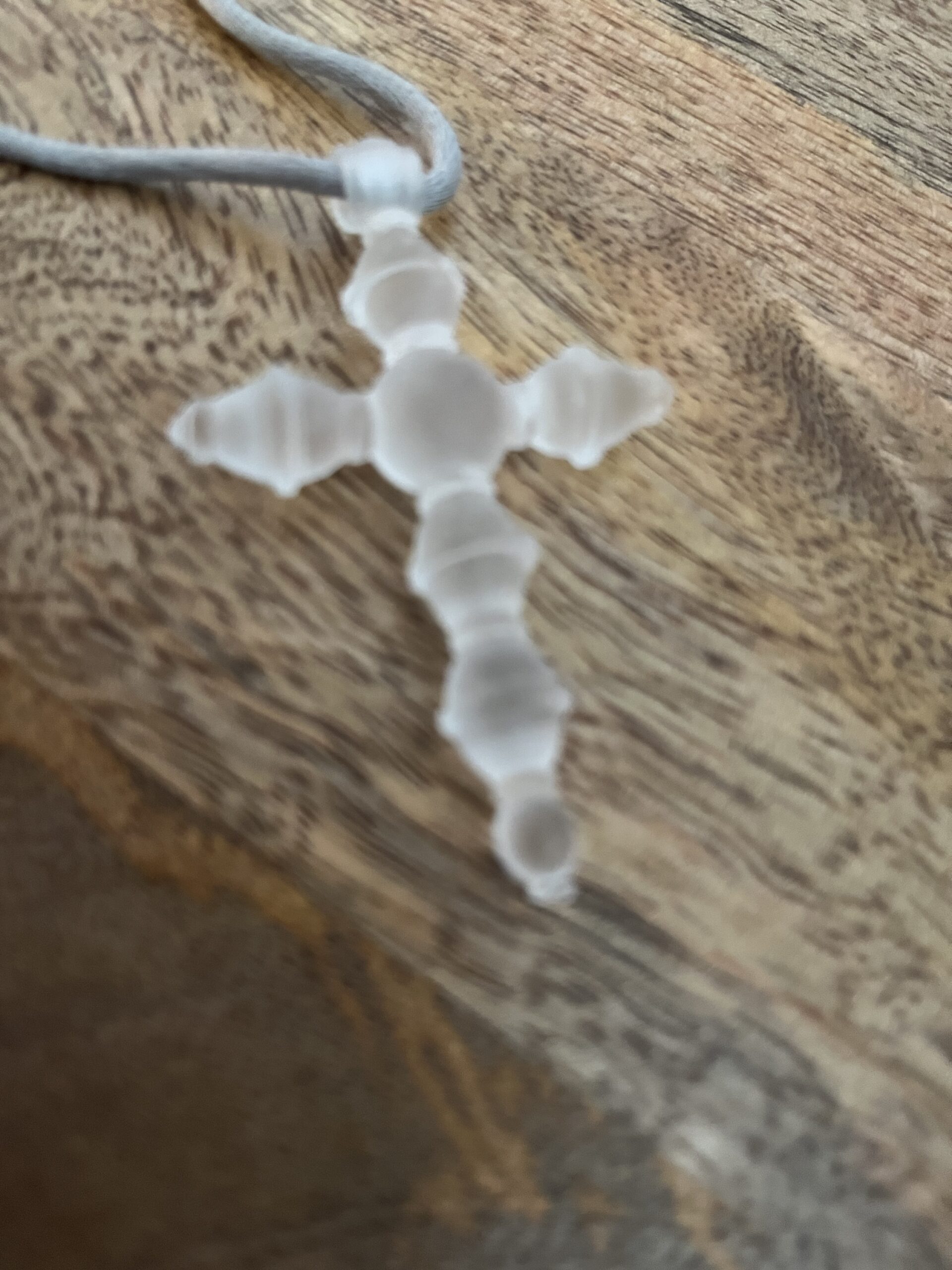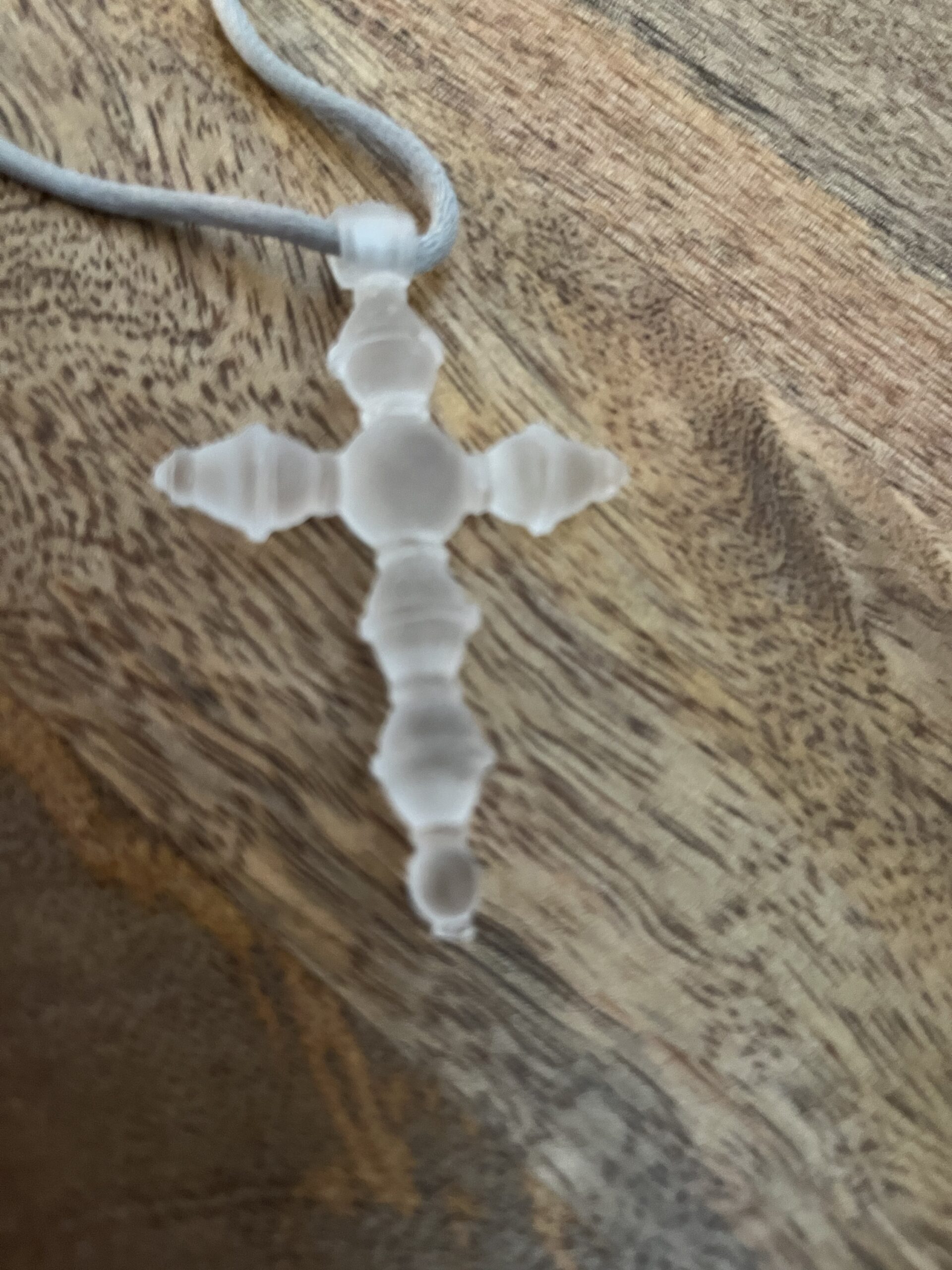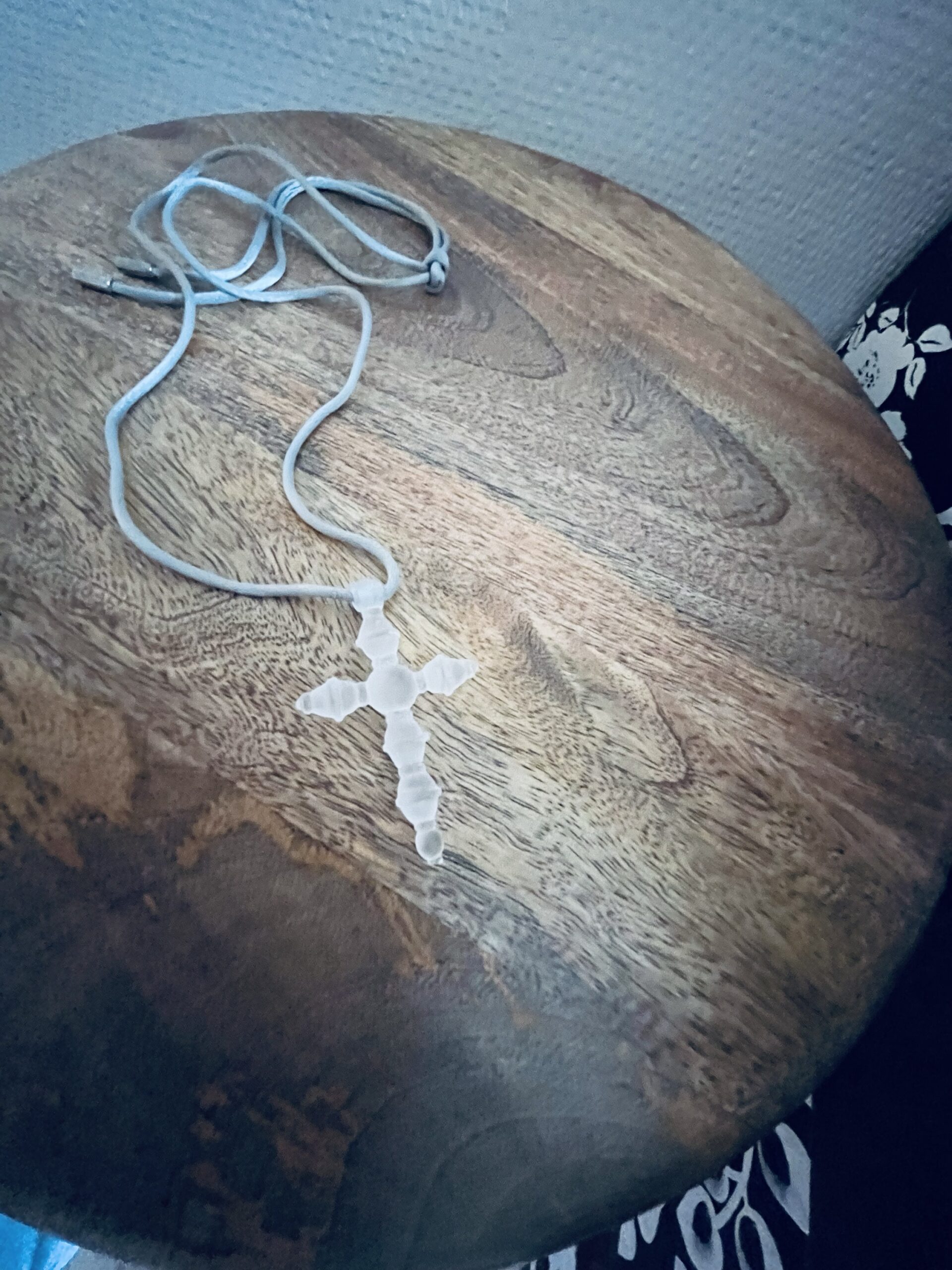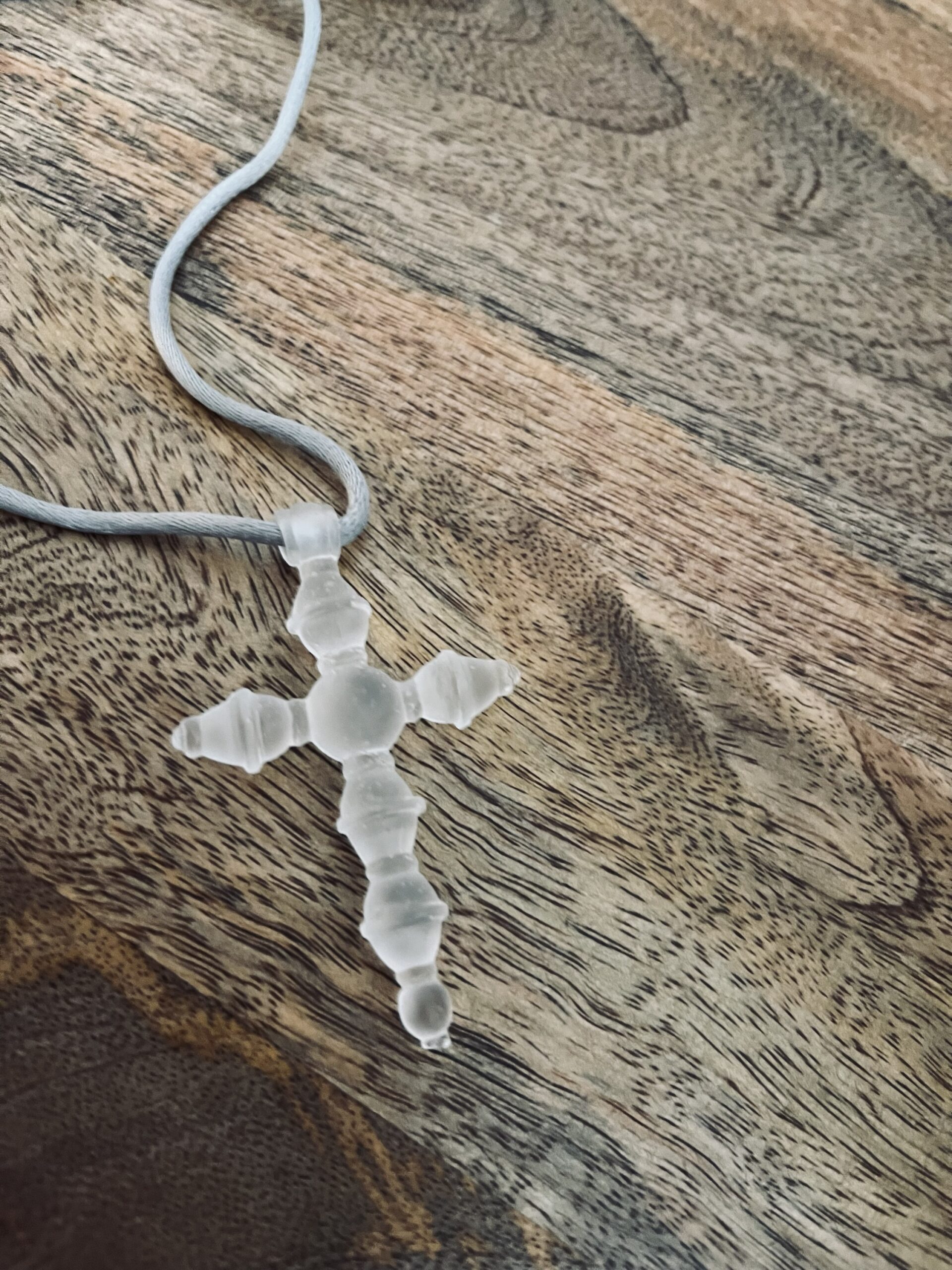 Ce pendentif croix en pâte de verre givrée se distingue par sa texture douce et sa lumière diffuse, dans un esprit inspiré des créations Daum.
