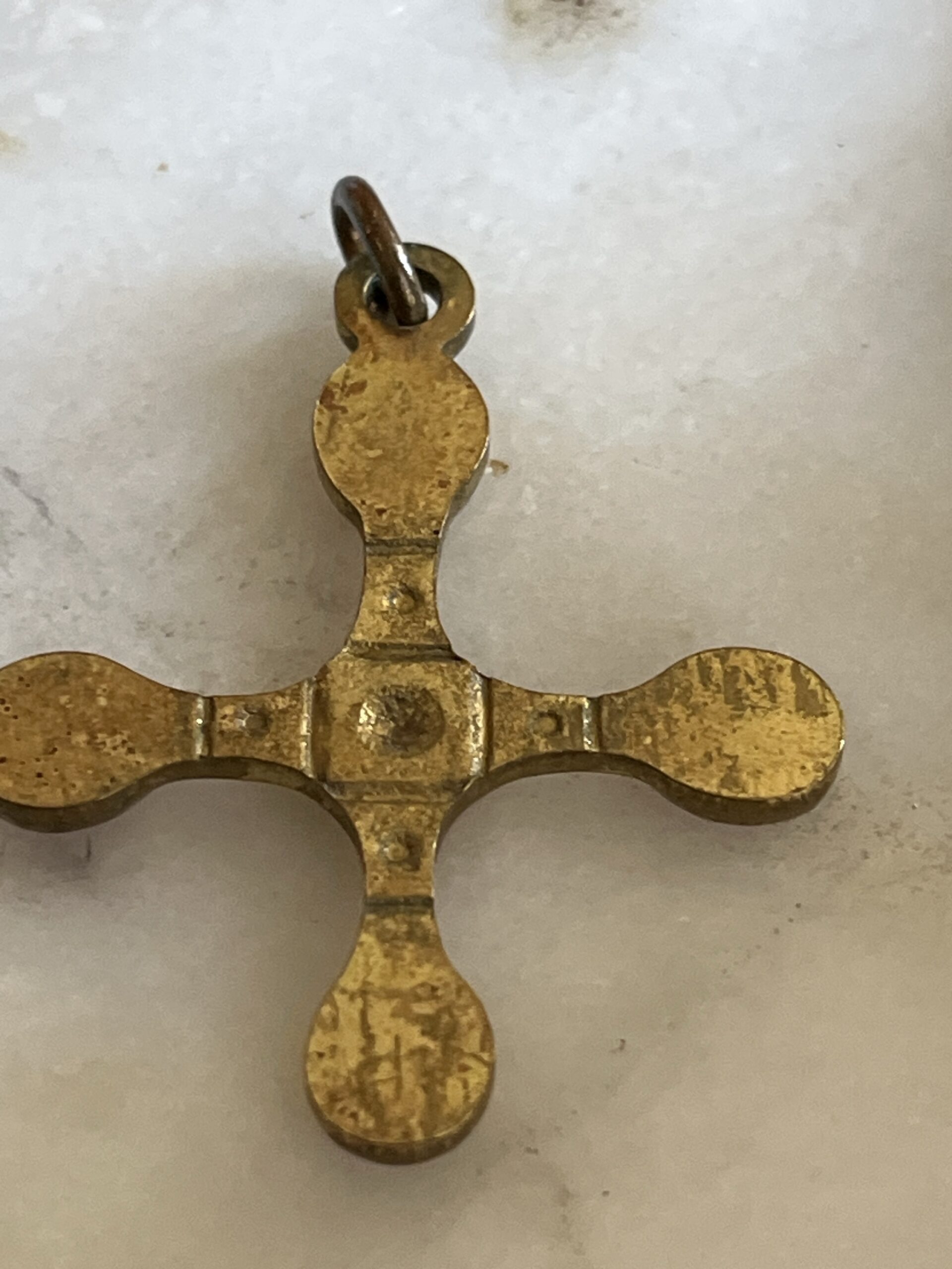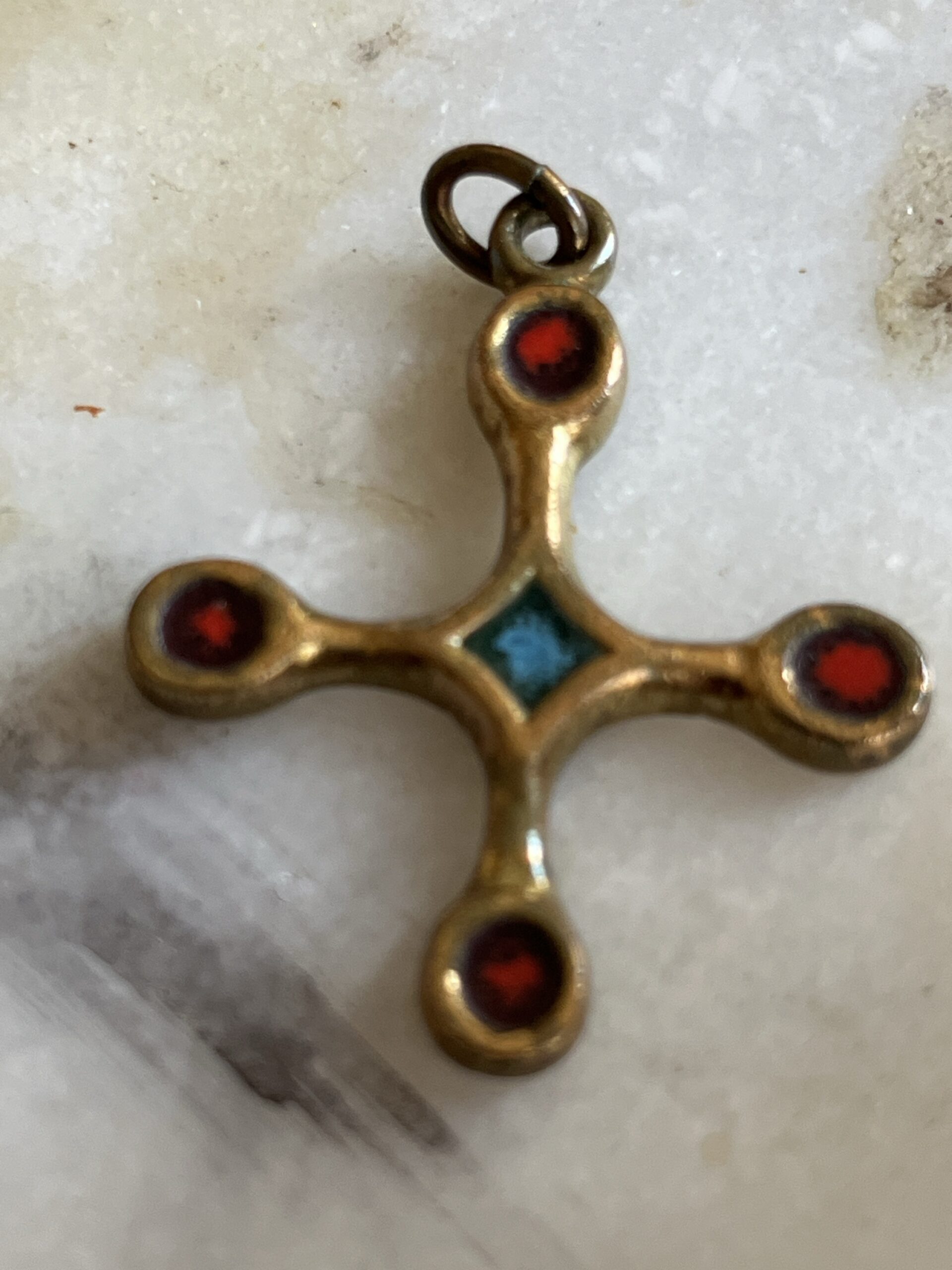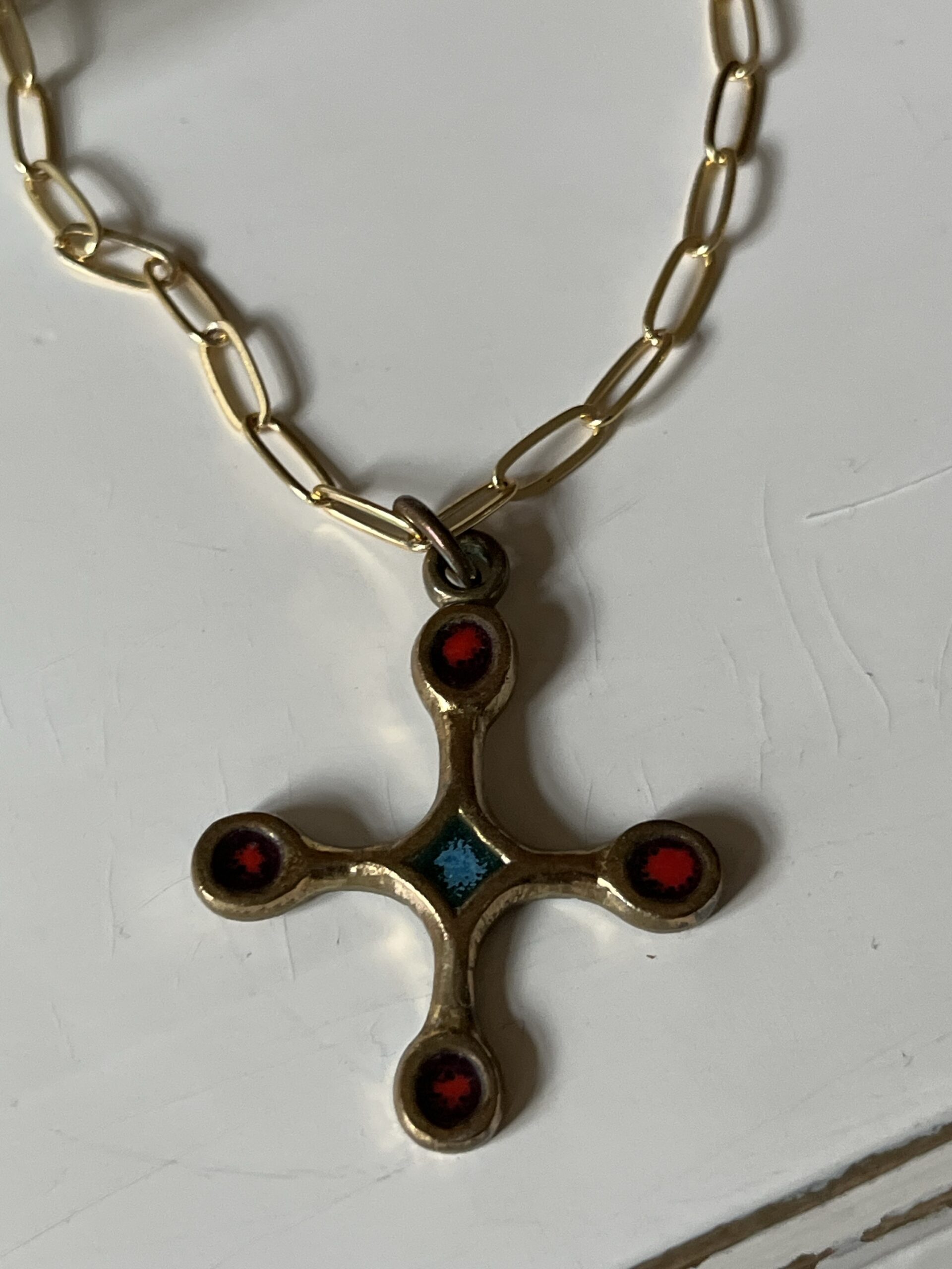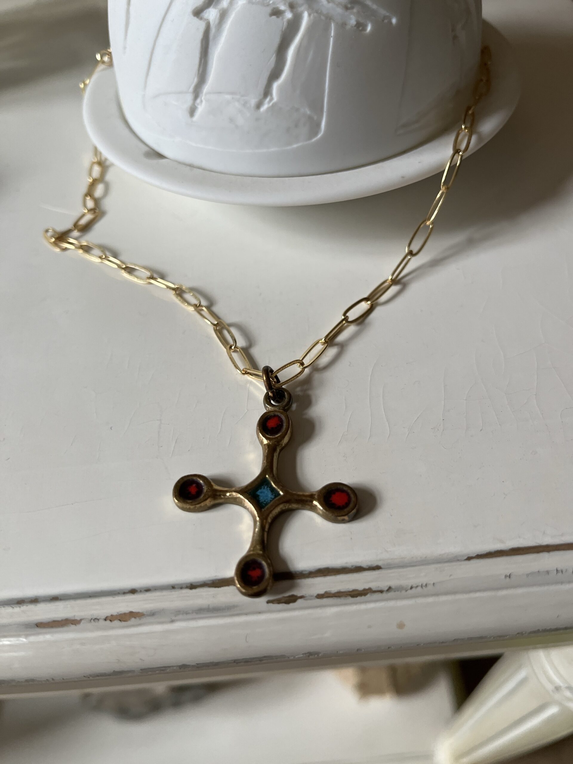 Croix vintage années 60–70 en bronze, ornée de cabochons émaillés rouges et d’un bleu en son centre. Bijou talisman au style méditerranéen, patine ancienne. Pièce unique Pièce singulière au charme ancien, cette croix aux lignes douces évoque les bijoux talismans du bassin méditerranéen. Son design équilibré, ponctué de cabochons rouges profonds et d’un centre vert lumineux, lui confère une présence à la fois spirituelle et décorative. Chaque détail semble porter une mémoire, celle des objets que l’on garde, que l’on transmet, que l’on choisit pour ce qu’ils racontent.