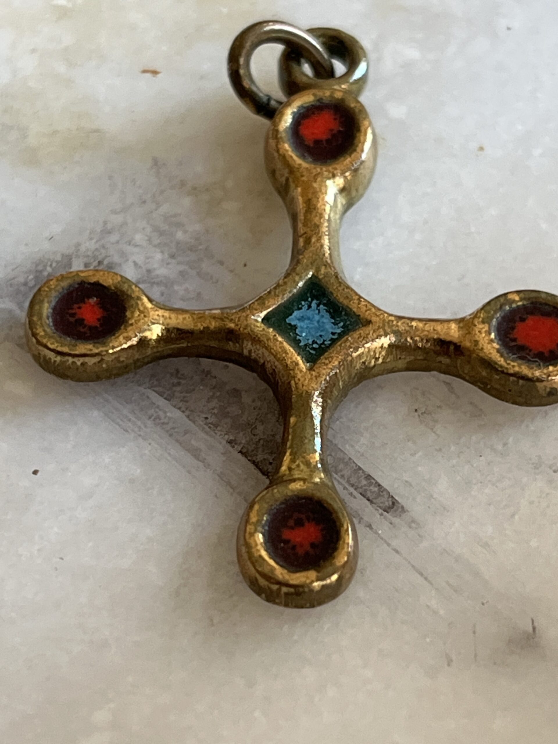 Pendentif croix pommelée bronze et émaux grand feu atelier Piéchaud 3,9 cm