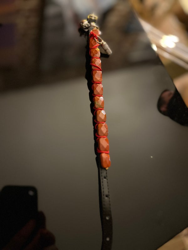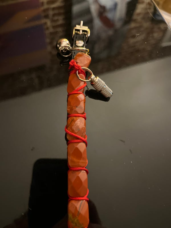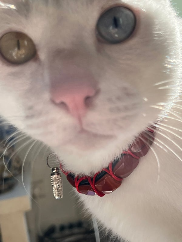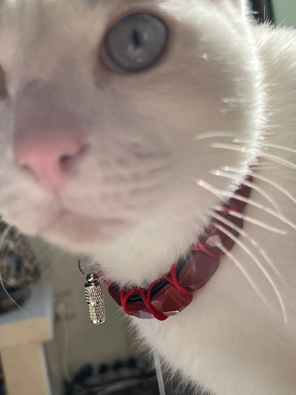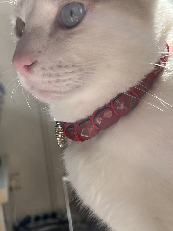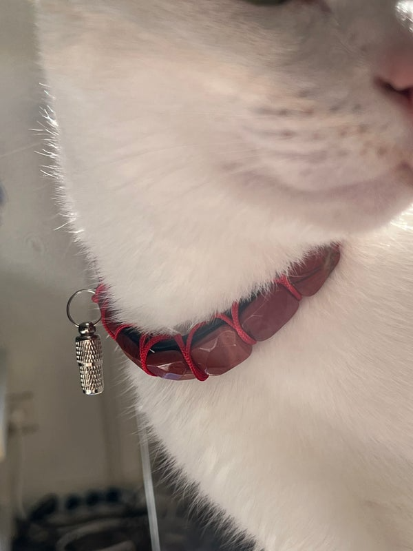 Conçu pour allier élégance et confort, Janus est un collier unique pour chat, associant la robustesse des matériaux à la noblesse des pierres naturelles. Le rouge profond de la couleur jaspe rouge, pierre d’ancrage et de vitalité, apporte une touche sophistiquée et symbolique, renforcée par un tressage minutieux en cordon rouge satiné.