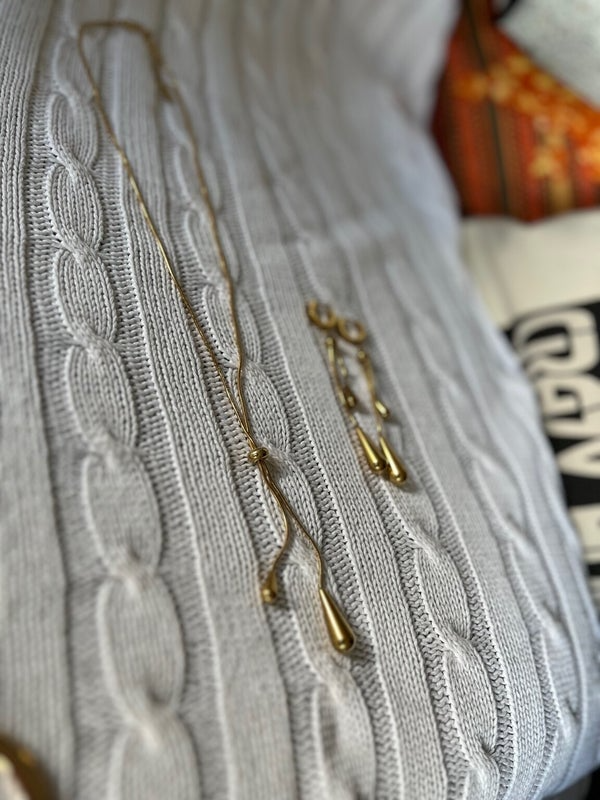 Inspirée par le mouvement naturel des gouttes d’eau et les rayons du soleil, cette parure dorée associe légèreté et sensualité. Le collier fin présente deux gouttes pendantes nouées en son centre, tandis que les boucles d’oreilles reprennent ce motif fluide et élégant.